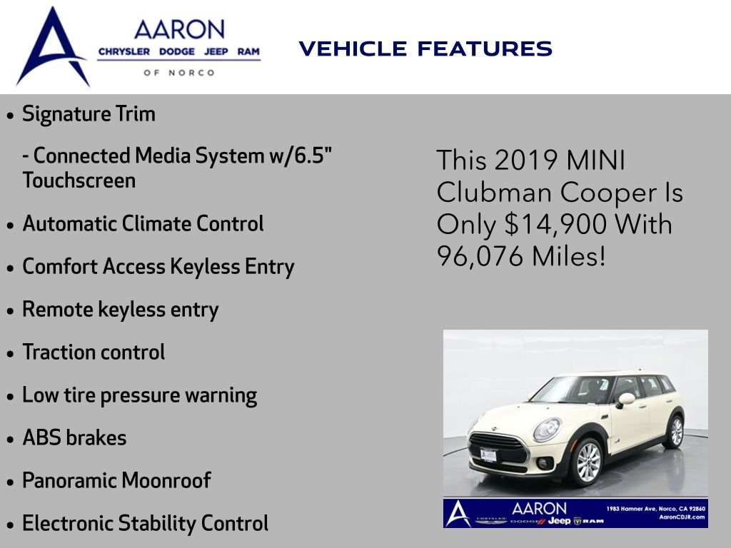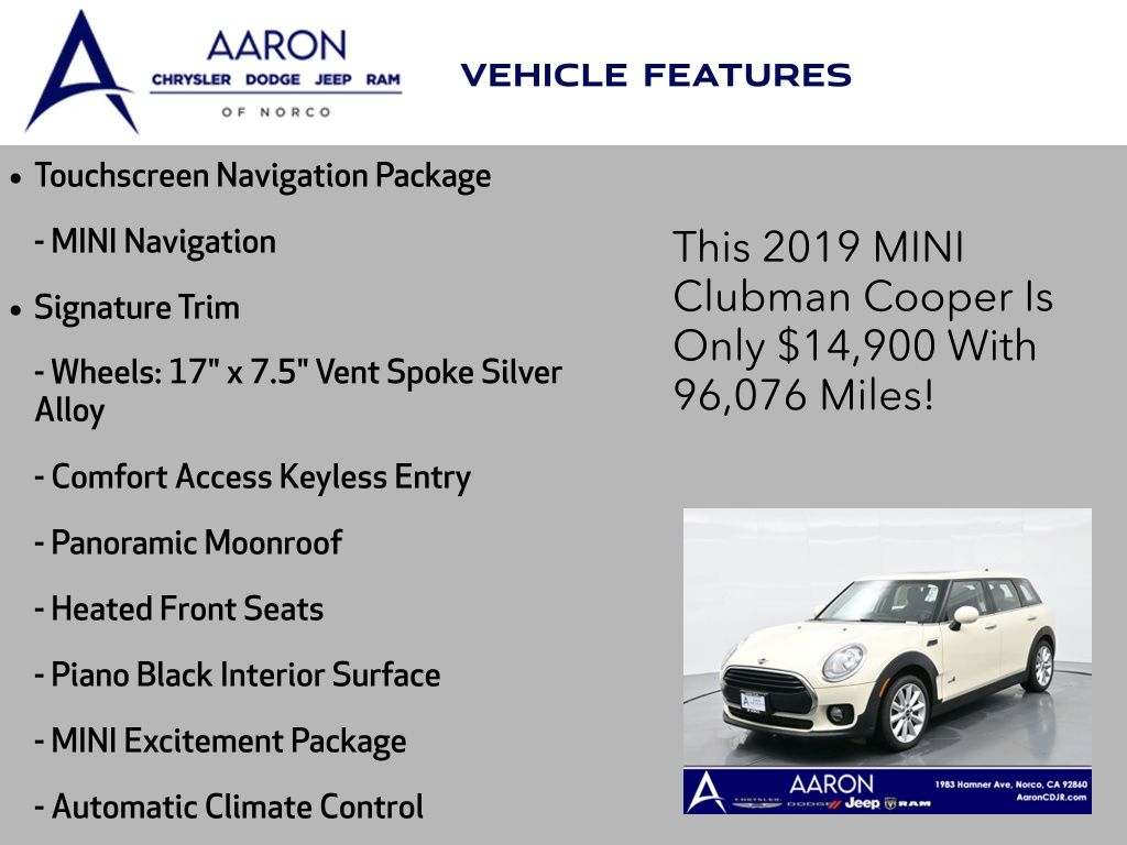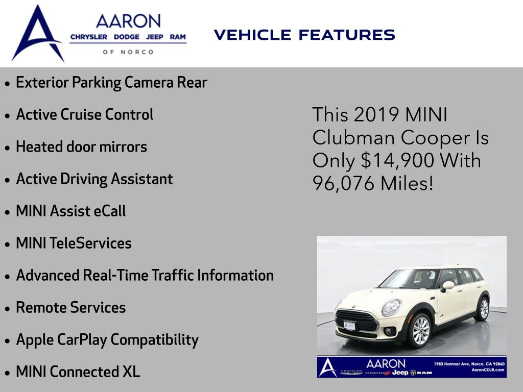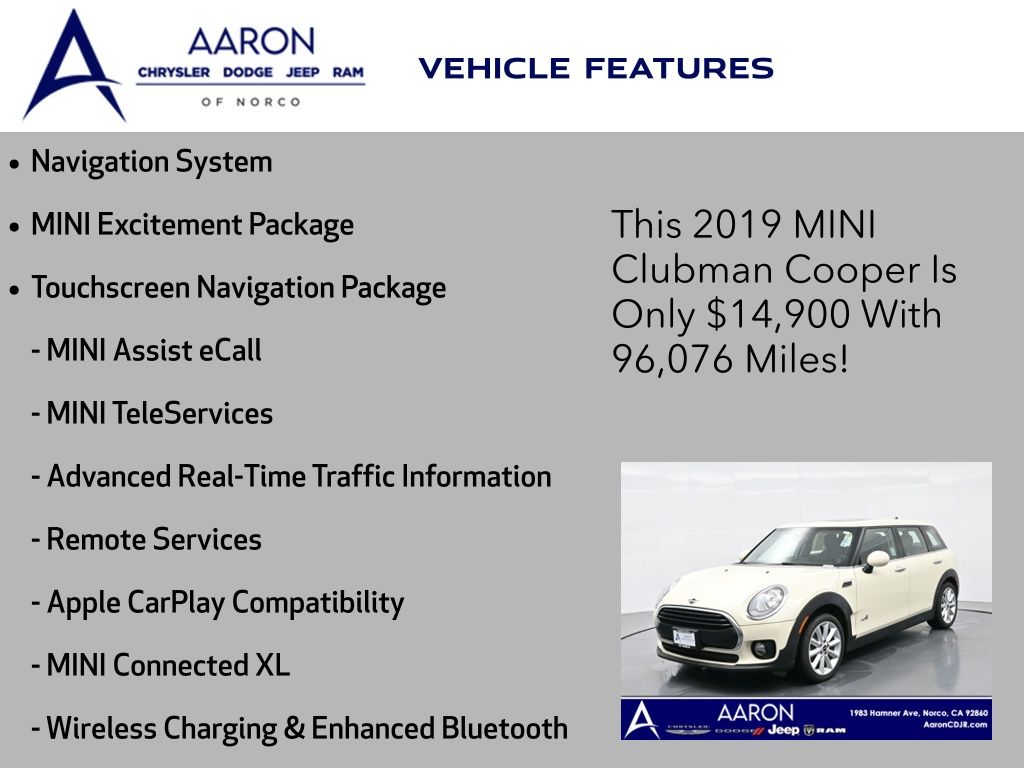 Priced below KBB Fair Purchase Price!4D Wagon, 1.5L I-3, 8-Speed Automatic Steptronic, AWD, Pepper White, Carbon Black Artificial Leather, ABS brakes, Active Cruise Control, Active Driving Assistant, Advanced Real-Time Traffic Information, Apple CarPlay Compatibility, Automatic Climate Control, Comfort Access Keyless Entry, Connected Media System w/6.5" Touchscreen, Electronic Stability Control, Exterior Parking Camera Rear, Heated door mirrors, Heated Front Seats, Illuminated entry, Low tire pressure warning, MINI Assist eCall, MINI Connected XL, MINI Excitement Package, MINI Navigation, MINI TeleServices, Navigation System, Panoramic Moonroof, Piano Black Interior Surface, Remote keyless entry, Remote Services, Signature Trim, Touchscreen Navigation Package, Traction control, Wheels: 17" x 7.5" Vent Spoke Silver Alloy, Wireless Charging & Enhanced Bluetooth.Clean CARFAX.
