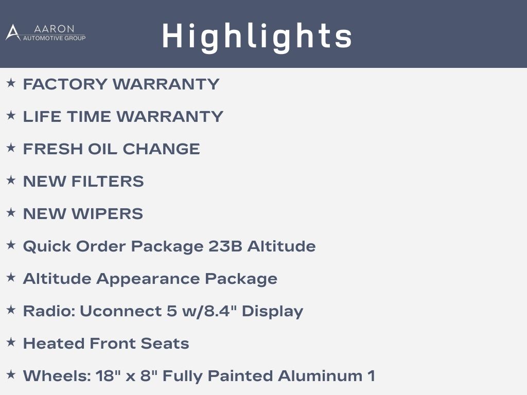 Priced below KBB Fair Purchase Price!FACTORY WARRANTY, LIFE TIME WARRANTY, FRESH OIL CHANGE, NEW FILTERS, NEW WIPERS, Grand Cherokee Altitude, 4D Sport Utility, 3.6L V6 24V VVT, 8-Speed Automatic, RWD, 115V Auxiliary Power Outlet, Alloy wheels, Altitude Appearance Package, Black Headliner, Brake assist, Capri Leatherette/Suede Seats, Delete Laredo Badge, Front dual zone A/C, Gloss Black Exterior Accents, Heated Front Seats, Heated Steering Wheel, Knee airbag, Overhead airbag, Power Liftgate, Quick Order Package 23B Altitude, Radio: Uconnect 5 w/8.4" Display, Rain Sensitive Windshield Wipers, Remote Start System, Roof rack: rails only, Selectable Tire Fill Alert, Spoiler, Wheels: 18" x 8" Fully Painted Aluminum 1, Wireless Charging Pad.Clean CARFAX.CARFAX One-Owner.