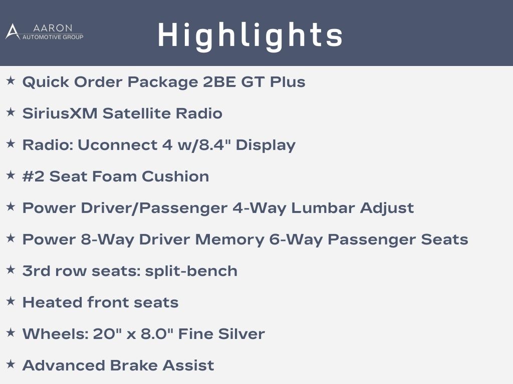 Priced below KBB Fair Purchase Price!AWD, #2 Seat Foam Cushion, 115V Auxiliary Power Outlet, 180 Amp Alternator, 3rd row seats: split-bench, Adaptive Cruise Control w/Stop, Advanced Brake Assist, Apple CarPlay/Android Auto, Auto-Dimming Exterior Driver Mirror, Body Color Exterior Mirrors, Bright Cargo Area Scuff Pads, Bright Front Door Sill Scuff Pads, Dual Remote USB Port - Charge Only, Exterior Mirrors w/Heating Element, Exterior Mirrors w/Memory, Exterior Mirrors w/Supplemental Signals, Full Speed Forward Collision Warning Plus, Google Android Auto, Heated front seats, Heated Second Row Seats, Heated steering wheel, Illuminated entry, Lane Departure Warning Plus, Leather Suede Bucket Seats, ParkView Rear Back-Up Camera, Power 6x9 Multi-Function Foldaway Mirrors, Power 8-Way Driver Memory 6-Way Passenger Seats, Power Driver/Passenger 4-Way Lumbar Adjust, Power Liftgate, Premium Door Trim Panel, Quick Order Package 2BE GT Plus, Radio: Uconnect 4 w/8.4" Display, Radio/Driver Seat/Mirrors Memory, Rain Sensitive Windshield Wipers, Remote keyless entry, Security Alarm, SiriusXM Satellite Radio, Sun Visors w/Illuminated Vanity Mirrors, Tungsten Accent Stitching, Universal Garage Door Opener, Wheels: 20" x 8.0" Fine Silver.Clean CARFAX.CARFAX One-Owner.