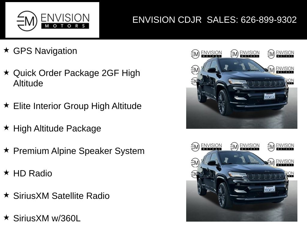 WE SPECIALIZE IN ALL CREDIT PROFILES! See what we can do for you! Call to find out (626) 899-9302.Certified. CARFAX One-Owner. Clean CARFAX.22/30 City/Highway MPG 4WD, 10.1" Touchscreen Display, 115V Auxiliary Power Outlet, 2nd Row Heated Seats, 2nd Row USB Type A/C Charge Only, 4G LTE Wi-Fi Hot Spot, Alexa Built-In, Auto High Beam Headlamp Control, Black Headliner, Body Color Door Claddings, Body Color Exterior Sill Moldings, Body Color Fascias, Body Color Wheel Flares, Cluster 10.25" TFT Color Display, Connected Travel & Traffic Services, Disassociated Touchscreen Display, Driver Seat Memory, Elite Interior Group High Altitude, Foot Activated Open 'N Go Liftgate, For Details, Visit DriveUconnect.com, For More Info, Call 800-643-2112, Global Telematics Box Module (TBM), Gloss Black Exterior Mirrors, Gloss Black Surround/Neutral Gray Rings, GPS Navigation, Gray Day Light Opening Moldings, HD Radio, High Altitude Package, Integrated Voice Command w/Bluetooth, LED Low/Highbeam Projector Headlamps, Liquid Chrome/Chainmail Hydro Accent, Neutral Gray Exterior Accents, Neutral Gray Exterior Badging, Neutral Gray Side Roof Rails, Power 8-Way Adjust Front Passenger Seat, Power Front/Fixed Rear Full Sunroof, Power Liftgate, Premium Alpine Speaker System, Premium Leather Trimmed Bucket Seats, Premium LED Fog Lamps, Premium Taillamps, Quick Order Package 2GF High Altitude, Radio: Uconnect 5 Nav w/10.1" Display, Reversible Carpet/Vinyl Cargo Mat, SiriusXM Guardian - Included Trial (B), SiriusXM Radio Service, SiriusXM Satellite Radio, SiriusXM w/360L, Tungsten Accent Stitching, Ventilated Front Seats, Wheels: 19" x 7.5" Aluminum Painted.Diamond Black Crystal Pearlcoat2022 Jeep Compass High Altitude 4WD 9-Speed 948TE Automatic 2.4L I4FCA US LLC Certified Pre-Owned Details: * Warranty Deductible: $100 * Vehicle History * Powertrain Limited Warranty: 84 Month/100,000 Mile (whichever comes first) from original in-service date * 125 Point Inspection * Limited Warranty: 3 Month/3,000 Mile (whichever comes first) after new car warranty expires or from certified purchase date * Roadside Assistance * Includes First Day Rental, Car Rental Allowance, and Trip Interruption Benefits. SiriusXM 3 month trial subscription * Transferable Warranty**********All Pricing and Advertised Prices for any/all vehicles offered for sale does not include dealer installed accessories which can be purchased for an additional cost.********** The Factory Rebates may not be available on this vehicle if you elect to take advantage of a Special Alternative APR or Special Lease program. Some Factory Rebates are California Resident specific and may vary for residents of other states. NO sales to Dealers, Brokers or Exporters. For out of state purchase, customers must be present to purchase. If shipping is required, dealership must facilitate; no exceptions. Please contact us for special Multi-Vehicle or Fleet pricing. Prices are plus government fees and taxes, any finance charges, $85 documentary fee, $29 electronic registration fee, any emission testing charge and $1.75 per new tire state tire fee. *** We make every effort to provide accurate information, but please verify before purchasing. Leasing & financing available on approved credit. Trade-ins accepted. Subject to prior sale.