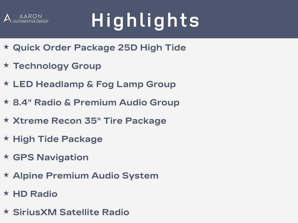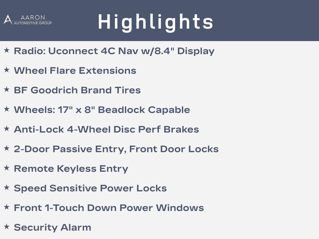 Priced below KBB Fair Purchase Price!1-Year SiriusXM Guardian Trial, 2-Door Passive Entry, Front Door Locks, 220 Amp Alternator, 35" Tire Suspension, 4.56 Rear Axle Ratio, 4G LTE Wi-Fi Hot Spot, 5-Year SiriusXM Traffic Service, 5-Year SiriusXM Travel Link Service, 8.4" Radio & Premium Audio Group, 8.4" Touchscreen Display, 97 MPH Vehicle Max Speed Calibration, Air Conditioning w/Auto Temperature Control, Air Filtering, Alpine Premium Audio System, Anti-Lock 4-Wheel Disc Perf Brakes, Anti-Spin Differential Rear Axle, Auto-Dimming Rear-View Mirror, Automatic Headlamps, BF Goodrich Brand Tires, Black Trail Rated Badge, Body Color 3-Piece Hard Top, Cluster 7.0" TFT Color Display, Corning Gorilla Glass, Dana M210 Wide HD Tube Front Axle, Dana M220 Wide Rear Axle, Deep Tint Sunscreen Windows, Emergency/Assistance Call, Freedom Panel Storage Bag, Front 1-Touch Down Power Windows, Front LED Fog Lamps, GPS Navigation, HD Radio, High Tide Hood Decal, High Tide Package, Injection Molded Black Rear Bumper, Leather Wrapped Steering Wheel, LED Headlamp & Fog Lamp Group, LED Premium Reflector Headlamps, Matte Black Jeep Badge, Mold In Color Bumper w/Gloss Black, Molded in Color Rubicon Highline Flare, MOPAR All-Weather Floor Mats, MOPAR Hinge-Gate Reinforcement, MOPAR Sunrider For Hardtop, No Soft Top, Off-Road Info Pages, ParkView Rear Back-Up Camera, Power Heated Mirrors, Quick Order Package 25D High Tide, Radio: Uconnect 4C Nav w/8.4" Display, Rear Window Defroster, Rear Window Wiper/Washer, Remote Keyless Entry, Security Alarm, SiriusXM Radio Service, SiriusXM Satellite Radio, SiriusXM Traffic Plus, SiriusXM Travel Link, Speed Sensitive Power Locks, Sun Visors w/Illuminated Vanity Mirrors, Technology Group, Wheel Flare Extensions, Wheels: 17" x 8" Beadlock Capable, Xtreme Recon 35" Tire Package.Clean CARFAX.CARFAX One-Owner.
