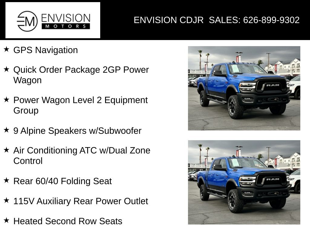 WE SPECIALIZE IN ALL CREDIT PROFILES! See what we can do for you! Call to find out (626) 899-9302.Certified. CARFAX One-Owner. Clean CARFAX.Odometer is 10336 miles below market average! #1 Seat Foam Cushion, 115V Auxiliary Rear Power Outlet, 2 Way Rear Headrest Seat, 2nd Row In Floor Storage Bins, 4 Way Front Headrests, 40/20/40 Split Bench Seat, 9 Alpine Speakers w/Subwoofer, Air Conditioning ATC w/Dual Zone Control, Auto High Beam Headlamp Control, Body Color Door Handles, Exterior Mirrors w/Memory, Foam Bottle Insert (Door Trim Panel), Folding Flat Load Floor Storage, Front Armrest w/Cupholders, Front Center Seat Cushion Storage, Front Door Accent Lighting, Front Seat Back Map Pockets, GPS Navigation, Heated Front Seats, Heated Second Row Seats, Heated Steering Wheel, High Back Seats, Leather Trim 40/20/40 Bench Seat, LED Dome Lamp w/On/Off Switch, LED Interior Lighting, Media Hub w/2 Charge Only USBs, Mirror-Mounted Aux Reverse Lamps, Overhead LED Lamps, Power 2-Way Driver Lumbar Adjust, Power 2-Way Passenger Lumbar Adjust, Power Adjust 8-Way Front Passenger Seat, Power Adjustable Convex Aux Mirrors, Power Adjustable Pedals w/Memory, Power Black Tow Mirrors w/Convex Spotter & Memory, Power Sunroof, Power Wagon Level 2 Equipment Group, Premium Overhead Console, Quick Order Package 2GP Power Wagon, Radio/Driver Seat/Mirrors/Pedals Memory, Rain Sensitive Windshield Wipers, Rear 60/40 Folding Seat, Rear Door Accent Lighting, Remote Proximity Keyless Entry, Remote Start System, Remote Tailgate Release, Security Alarm, Sun Visors w/Illuminated Vanity Mirrors, Universal Garage Door Opener, Ventilated Front Seats, Wheels: 17" x 8.0" Matte Black/Diamond Cut.Hydro Blue Pearlcoat2021 Ram 2500 Power Wagon 4WD 8-Speed Automatic 6.4L V8FCA US LLC Certified Pre-Owned Details: * Includes First Day Rental, Car Rental Allowance, and Trip Interruption Benefits. SiriusXM 3 month trial subscription. * Vehicle History * Powertrain Limited Warranty: 84 Month/100,000 Mile (whichever comes first) from original in-service date * Warranty Deductible: $100 * 125 Point Inspection * Roadside Assistance * Transferable Warranty * Limited Warranty: 3 Month/3,000 Mile (whichever comes first) after new car warranty expires or from certified purchase date**********All Pricing and Advertised Prices for any/all vehicles offered for sale does not include dealer installed accessories which can be purchased for an additional cost.********** The Factory Rebates may not be available on this vehicle if you elect to take advantage of a Special Alternative APR or Special Lease program. Some Factory Rebates are California Resident specific and may vary for residents of other states. NO sales to Dealers, Brokers or Exporters. For out of state purchase, customers must be present to purchase. If shipping is required, dealership must facilitate; no exceptions. Please contact us for special Multi-Vehicle or Fleet pricing. Prices are plus government fees and taxes, any finance charges, $85 documentary fee, $29 electronic registration fee, any emission testing charge and $1.75 per new tire state tire fee. *** We make every effort to provide accurate information, but please verify before purchasing. Leasing & financing available on approved credit. Trade-ins accepted. Subject to prior sale.Awards: * JD Power Initial Quality Study (IQS)