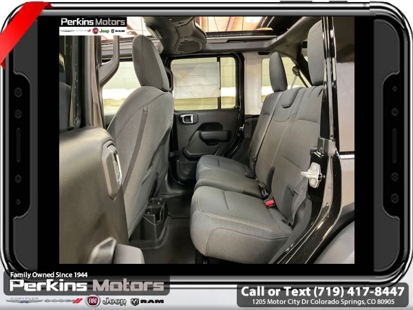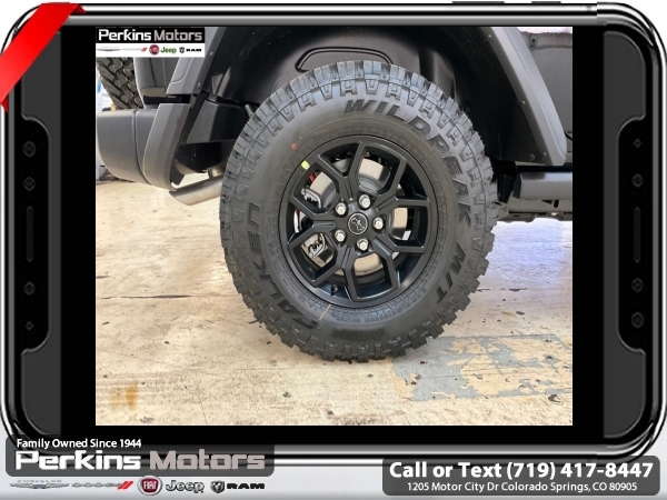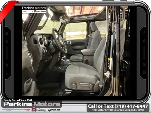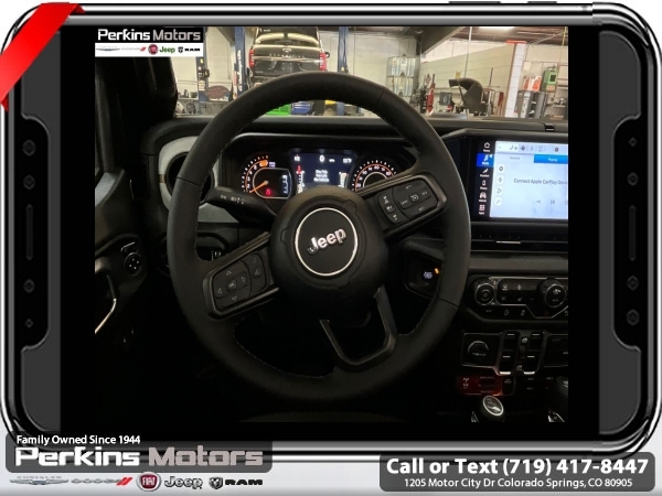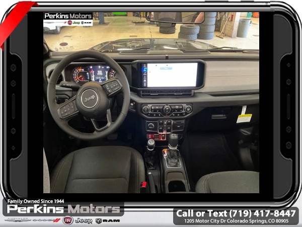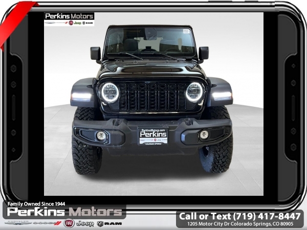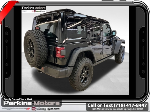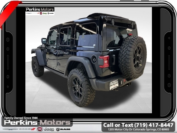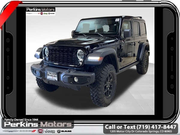 Factory MSRP: $57,835 $7,482 off MSRP! Black Clearcoat 2025 Jeep Wrangler Willys 4WD 8-Speed Automatic 2.0L I4 DOHC<br><br>Check us out at www.perkinsmotors.com to see our specials! Since opening our doors in 1944, we’ve been proud to serve Colorado Springs, CO, and the surrounding areas of Pueblo, Castle Rock and Denver, CO. Throughout this time of being family owned for 80 years, we’ve maintained a firm commitment to our customers: to offer a wide selection of New Chrysler, Dodge, Fiat, Jeep, and Ram vehicles and quality pre-owned vehicles, and provide a quick, no-hassle car-buying process that ensures everyone drives off the lot satisfied with their purchase.<br><br>Convenience Group (2-Door Passive Entry, Front Door Locks, Air Conditioning w/Auto Temperature Control, Air Filtering, Cluster 7.0 TFT Color Display, Emergency/Assistance Call, Heated Front Seats, Heated Steering Wheel, Remote Start System, and Universal Garage Door Opener), Quick Order Package 22W Willys (4-Wheel Drive Swing Gate Decal, 4.10 Rear Axle Ratio, 7 & 4 Pin Wiring Harness, 97 MPH Vehicle Max Speed Calibration, Advanced Brake Assist, Automatic Headlamps, Auxiliary Switches, Black Grille, Class II Receiver Hitch, Conventional Differential Front Axle, Corning Gorilla Glass, Dana M210 Wide HD Tube Front Axle, Dana M220 Wide Rear Axle, Daytime Running Lamps LED Accents, Deep Tint Sunscreen Windows, E-Locker Rear Axle, Enhanced Adaptive Cruise Control, Front LED Fog Lamps, Full Speed Forward Collision Warning Plus, Injection Molded Black Rear Bumper, LED Premium Reflector Headlamps, Mold In Color Bumper w/Gloss Black, Molded in Color Rubicon Highline Flare, MOPAR All-Weather Floor Mats, Off-Road Plus Mode, Power Heated Mirrors, Premium Wrapped Steering Wheel, Security Alarm, Sun Visors w/Illuminated Vanity Mirrors, Wheels: 17 x 7.5 Painted Black, Willy's Suspension, and Willys Hood Decal), Safety Group (Auto High Beam Headlamp Control, Blind Spot & Cross Path Detection, LED Taillamps, and ParkSense Rear Park Assist System), 110 MPH Vehicle Max Speed Calibration, 3.45 Overall Top Gear Ratio, 4-Wheel Disc Brakes, 8 Speakers, ABS brakes, Air Conditioning, AM/FM radio: SiriusXM, Apple CarPlay/Android Auto, Aux Battery, Brake assist, Cloth Low-Back Bucket Seats, Compass, Cruise Control, Delay-off headlights, Driver door bin, Driver vanity mirror, Dual front impact airbags, Dual front side impact airbags, Electronic Stability Control, Front anti-roll bar, Front Bucket Seats, Front Center Armrest w/Storage, Front fog lights, Front reading lights, Illuminated entry, Integrated roll-over protection, Jeep Trail Rated Kit, Low tire pressure warning, MOPAR Doors Off Mirror Kit, MOPAR Hinge-Gate Reinforcement, Non-Lock Fuel Cap w/o Discriminator, Normal Duty Suspension, Occupant sensing airbag, Outside temperature display, Overhead airbag, Panic alarm, ParkView Rear Back-Up Camera, Passenger door bin, Passenger vanity mirror, Power steering, Power Top Quarter Window Storage Bag, Power windows, Radio data system, Radio: Uconnect 5 w/12.3 Display, Rear anti-roll bar, Rear reading lights, Rear Window Defroster, Rear Window Wiper/Washer, Remote keyless entry, Removable Rear Quarter Windows, Sky 1-Touch Power Top, Split folding rear seat, Steering wheel mounted audio controls, Stop-Start Dual Battery System, Tachometer, Telescoping steering wheel, Tilt steering wheel, Traction control, Trip computer, Variably intermittent wipers, and Wheels: 17 x 7.5 Black Steel Styled.