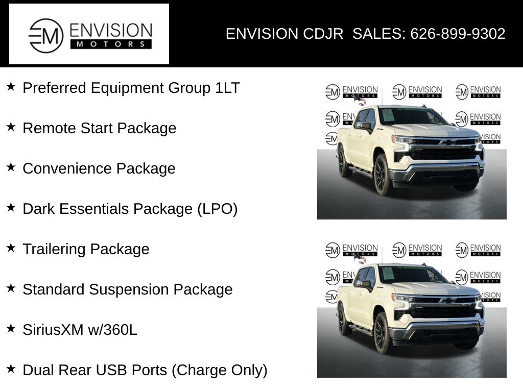 WE SPECIALIZE IN ALL CREDIT PROFILES! See what we can do for you! Call to find out (626) 899-9302.CARFAX One-Owner. Clean CARFAX.Odometer is 775 miles below market average! 8-Speed Automatic, Jet Black w/Cloth Seat Trim, 10-Way Power Driver Seat w/Lumbar, 12.3" Multicolor Reconfigurable Digital Display, 120-Volt Bed Mounted Power Outlet, 120-Volt Interior Power Outlet, All-Star Edition, Auto-Locking Rear Differential, Black Name Plates (LPO), Bluetooth® For Phone, Chevrolet Connected Access Capable, Chrome Mirror Caps, Color-Keyed Carpeting Floor Covering, Convenience Package, Dark Essentials Package (LPO), Deep-Tinted Glass, Dual Rear USB Ports (Charge Only), Dual-Zone Automatic Climate Control, Electric Rear-Window Defogger, Electrical Steering Column Lock, Electronic Cruise Control, EZ Lift Power Lock & Release Tailgate, Front Rubberized Vinyl Floor Mats, HD Rear Vision Camera, Heated Driver & Front Outboard Passenger Seats, Heated Power-Adjustable Outside Mirrors, Heated Steering Wheel, Hitch Guidance, Inside Rear-View Mirror w/Tilt, Keyless Open & Start, LED Cargo Area Lighting, OnStar & Chevrolet Connected Services Capable, Power Front Windows w/Driver Express Up/Down, Power Front Windows w/Passenger Express Down, Power Rear Windows w/Express Down, Preferred Equipment Group 1LT, Rear 60/40 Folding Bench Seat (Folds Up), Rear Rubberized-Vinyl Floor Mats, Remote Start Package, Remote Vehicle Starter System, SiriusXM w/360L, Standard Suspension Package, Standard Tailgate, Steering Wheel Audio Controls, Theft Deterrent System (Unauthorized Entry), Trailering Package, Wi-Fi Hot Spot Capable, Wrapped Steering Wheel.Summit White2024 Chevrolet Silverado 1500 LT RWD 8-Speed Automatic 2.7L I4 Turbocharged DOHC 16V LEV3-SULEV30 310hp**********All Pricing and Advertised Prices for any/all vehicles offered for sale does not include dealer installed accessories which can be purchased for an additional cost.********** The Factory Rebates may not be available on this vehicle if you elect to take advantage of a Special Alternative APR or Special Lease program. Some Factory Rebates are California Resident specific and may vary for residents of other states. NO sales to Dealers, Brokers or Exporters. For out of state purchase, customers must be present to purchase. If shipping is required, dealership must facilitate; no exceptions. Please contact us for special Multi-Vehicle or Fleet pricing. Prices are plus government fees and taxes, any finance charges, $85 documentary fee, $29 electronic registration fee, any emission testing charge and $1.75 per new tire state tire fee. *** We make every effort to provide accurate information, but please verify before purchasing. Leasing & financing available on approved credit. Trade-ins accepted. Subject to prior sale.