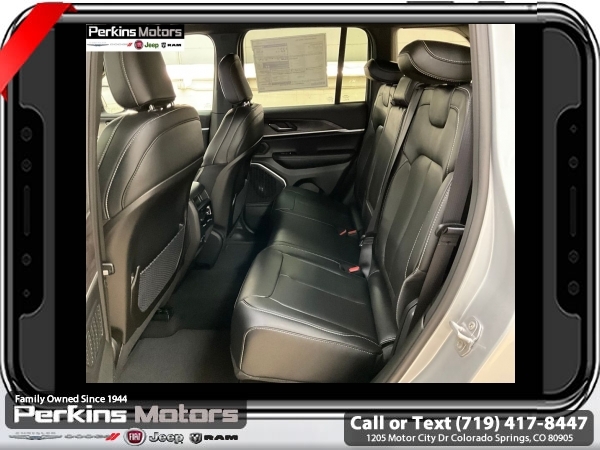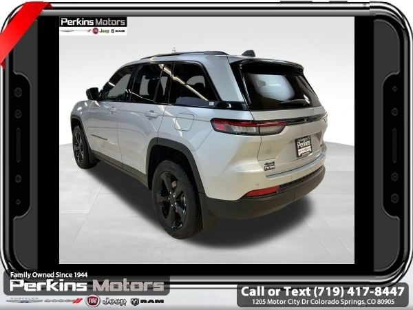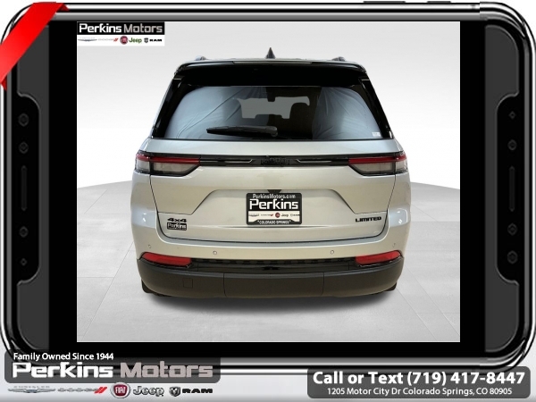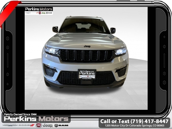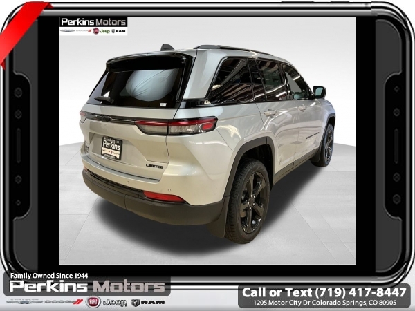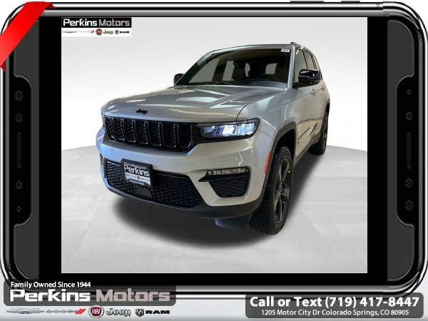 Factory MSRP: $55,730 $8,103 off MSRP! Silver Zynith 2025 Jeep Grand Cherokee Limited 4WD 8-Speed Automatic 3.6L V6 24V VVT<br>4WD.<br>Check us out at www.perkinsmotors.com to see our specials! Since opening our doors in 1944, we’ve been proud to serve Colorado Springs, CO, and the surrounding areas of Pueblo, Castle Rock and Denver, CO. Throughout this time of being family owned for 80 years, we’ve maintained a firm commitment to our customers: to offer a wide selection of New Chrysler, Dodge, Fiat, Jeep, and Ram vehicles and quality pre-owned vehicles, and provide a quick, no-hassle car-buying process that ensures everyone drives off the lot satisfied with their purchase.<br><br>Black Appearance Package (Gloss Black Exterior Accents and Wheels: 20 x 8.5 Gloss Black Painted Aluminum), MOPAR Finishing Package (MOPAR Front Splash Guards, MOPAR Paint Protection Film, and MOPAR Rear Splash Guards w/Jeep Logo), Quick Order Package 22E, Trailer Tow Package (220 Amp Alternator, 7 & 4-Pin Wiring Harness, Automatic Headlamp Levelling System, Class IV Receiver Hitch, Heavy-Duty Engine Cooling, Rear Load Levelling Suspension, and Trailer Hitch Zoom), 4WD, 4-Wheel Disc Brakes, 506 Watt Amplifier, 6 Speakers, 9 Amplified Speakers w/Subwoofer, ABS brakes, Active Noise Control System, Air Conditioning, Alloy wheels, AM/FM radio: SiriusXM with 360L, Anti-whiplash front head restraints, Audio memory, Auto High-beam Headlights, Automatic temperature control, Brake assist, Bumpers: body-color, Capri Leatherette Seats, Compass, Cruise Control, Delay-off headlights, Driver door bin, Driver vanity mirror, Dual front impact airbags, Dual front side impact airbags, Dual-Pane Panoramic Sunroof, Electronic Stability Control, Emergency communication system, Four wheel independent suspension, Front anti-roll bar, Front Bucket Seats, Front Center Armrest w/Storage, Front dual zone A/C, Front fog lights, Front License Plate Bracket, Front reading lights, Fully automatic headlights, Garage door transmitter, Heated door mirrors, Heated front seats, Heated rear seats, Heated steering wheel, Illuminated entry, Knee airbag, Low tire pressure warning, Memory seat, Model Year Tracking, Navigation System, Normal Duty Suspension, Occupant sensing airbag, Outside temperature display, Overhead airbag, Overhead console, Panic alarm, ParkView Rear Back-Up Camera, Passenger door bin, Passenger vanity mirror, Power door mirrors, Power driver seat, Power Liftgate, Power passenger seat, Power steering, Power windows, Radio data system, Radio: Uconnect 5 Nav w/10.1 Display, Rear anti-roll bar, Rear reading lights, Rear window defroster, Rear window wiper, Remote keyless entry, Security system, Speed-Sensitive Wipers, Split folding rear seat, Spoiler, Steering wheel mounted audio controls, Tachometer, Telescoping steering wheel, Tilt steering wheel, Traction control, Trip computer, Turn signal indicator mirrors, Variably intermittent wipers, Voltmeter, and Wheels: 18 x 8 Polished/Painted Aluminum.<br><br>19/26 City/Highway MPG Sale price includes all manufacture's incentives and dealer discounts. Sale price not available on lease or compatible with special APR. $1000 - 2025 National Bonus Cash . Exp. 06/30/2025
