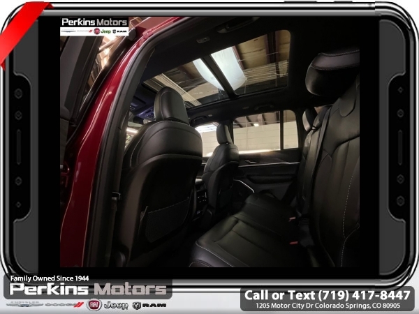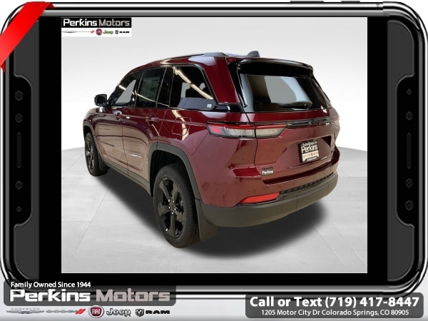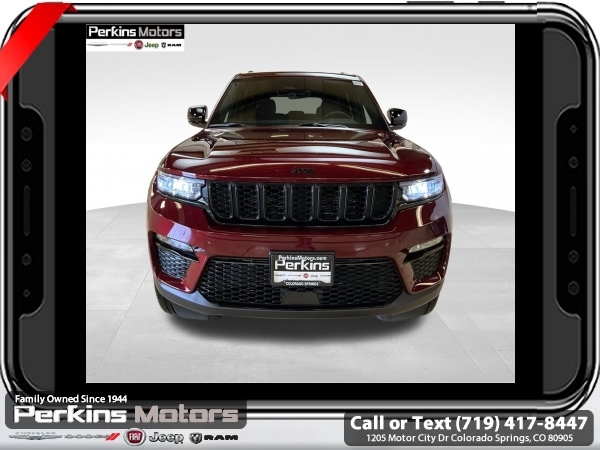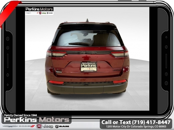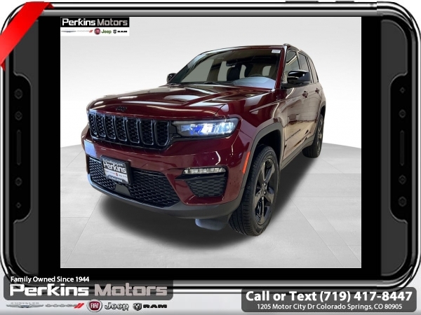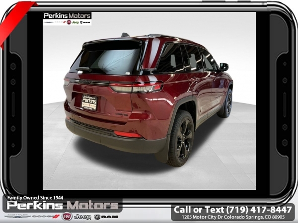 Factory MSRP: $55,730 $7,103 off MSRP! Velvet Red Pearlcoat 2025 Jeep Grand Cherokee Limited 4WD 8-Speed Automatic 3.6L V6 24V VVT<br>4WD.<br>Check us out at www.perkinsmotors.com to see our specials! Since opening our doors in 1944, we’ve been proud to serve Colorado Springs, CO, and the surrounding areas of Pueblo, Castle Rock and Denver, CO. Throughout this time of being family owned for 80 years, we’ve maintained a firm commitment to our customers: to offer a wide selection of New Chrysler, Dodge, Fiat, Jeep, and Ram vehicles and quality pre-owned vehicles, and provide a quick, no-hassle car-buying process that ensures everyone drives off the lot satisfied with their purchase.<br><br>Black Appearance Package (Gloss Black Exterior Accents and Wheels: 20 x 8.5 Gloss Black Painted Aluminum), MOPAR Finishing Package (MOPAR Front Splash Guards, MOPAR Paint Protection Film, and MOPAR Rear Splash Guards w/Jeep Logo), Quick Order Package 23E (DISC), Trailer Tow Package (220 Amp Alternator, 7 & 4-Pin Wiring Harness, Automatic Headlamp Levelling System, Class IV Receiver Hitch, Heavy-Duty Engine Cooling, Rear Load Levelling Suspension, and Trailer Hitch Zoom), 4WD, 4-Wheel Disc Brakes, 506 Watt Amplifier, 6 Speakers, 9 Amplified Speakers w/Subwoofer, ABS brakes, Active Noise Control System, Air Conditioning, Alloy wheels, AM/FM radio: SiriusXM with 360L, Anti-whiplash front head restraints, Audio memory, Auto High-beam Headlights, Automatic temperature control, Brake assist, Bumpers: body-color, Capri Leatherette Seats, Compass, Cruise Control, Delay-off headlights, Driver door bin, Driver vanity mirror, Dual front impact airbags, Dual front side impact airbags, Dual-Pane Panoramic Sunroof, Electronic Stability Control, Emergency communication system, Four wheel independent suspension, Front anti-roll bar, Front Bucket Seats, Front Center Armrest w/Storage, Front dual zone A/C, Front fog lights, Front License Plate Bracket, Front reading lights, Fully automatic headlights, Garage door transmitter, Heated door mirrors, Heated front seats, Heated rear seats, Heated steering wheel, Illuminated entry, Knee airbag, Low tire pressure warning, Memory seat, Model Year Tracking, Navigation System, Normal Duty Suspension, Occupant sensing airbag, Outside temperature display, Overhead airbag, Overhead console, Panic alarm, ParkView Rear Back-Up Camera, Passenger door bin, Passenger vanity mirror, Power door mirrors, Power driver seat, Power Liftgate, Power passenger seat, Power steering, Power windows, Radio data system, Radio: Uconnect 5 Nav w/10.1 Display, Rear anti-roll bar, Rear reading lights, Rear window defroster, Rear window wiper, Remote keyless entry, Security system, Speed-Sensitive Wipers, Split folding rear seat, Spoiler, Steering wheel mounted audio controls, Tachometer, Telescoping steering wheel, Tilt steering wheel, Traction control, Trip computer, Turn signal indicator mirrors, Variably intermittent wipers, Voltmeter, and Wheels: 18 x 8 Polished/Painted Aluminum.<br><br>19/26 City/Highway MPG