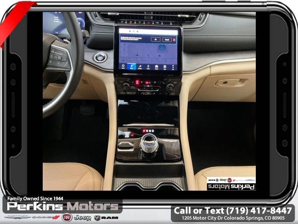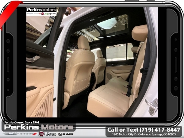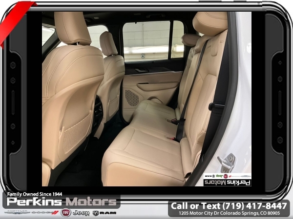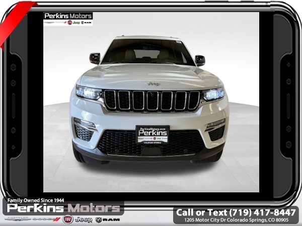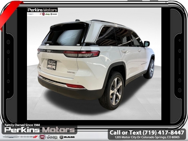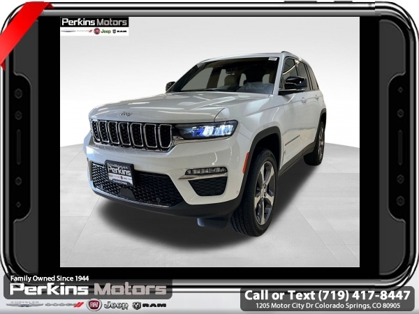 Factory MSRP: $55,760 $7,140 off MSRP! Bright White Clearcoat 2025 Jeep Grand Cherokee Limited 4WD 8-Speed Automatic 3.6L V6 24V VVT<br>4WD.<br>Check us out at www.perkinsmotors.com to see our specials! Since opening our doors in 1944, we’ve been proud to serve Colorado Springs, CO, and the surrounding areas of Pueblo, Castle Rock and Denver, CO. Throughout this time of being family owned for 80 years, we’ve maintained a firm commitment to our customers: to offer a wide selection of New Chrysler, Dodge, Fiat, Jeep, and Ram vehicles and quality pre-owned vehicles, and provide a quick, no-hassle car-buying process that ensures everyone drives off the lot satisfied with their purchase.<br><br>Luxury Tech Group II (2nd-Row Manual Window Shades, Auto-Dimming Exterior Driver Mirror, Capri Leatherette w/Axis II Seats, Front/Rear Doors & Liftgate w/Passive Entry, Integrated Off-Road Camera, Intersection Collision Assist System, Memory Steering Column, ParkSense Front/Rear Park Assist w/Stop, Power Tilt/Telescope Steering Column, Rain Sensitive Windshield Wipers, Rear Back-Up Camera Washer, Rearview Autodim Digital Display Mirror, Surround View Camera System, Ventilated Front Seats, and Wireless Charging Pad), Quick Order Package 23E (DISC), Trailer Tow Package (220 Amp Alternator, 7 & 4-Pin Wiring Harness, Automatic Headlamp Levelling System, Class IV Receiver Hitch, Heavy-Duty Engine Cooling, Rear Load Levelling Suspension, and Trailer Hitch Zoom), 4WD, 4-Wheel Disc Brakes, 6 Speakers, ABS brakes, Active Noise Control System, Air Conditioning, Alloy wheels, AM/FM radio: SiriusXM with 360L, Anti-whiplash front head restraints, Audio memory, Auto High-beam Headlights, Automatic temperature control, Brake assist, Bumpers: body-color, Capri Leatherette Seats, Compass, Cruise Control, Delay-off headlights, Driver door bin, Driver vanity mirror, Dual front impact airbags, Dual front side impact airbags, Dual-Pane Panoramic Sunroof, Electronic Stability Control, Emergency communication system, Four wheel independent suspension, Front anti-roll bar, Front Bucket Seats, Front Center Armrest w/Storage, Front dual zone A/C, Front fog lights, Front License Plate Bracket, Front reading lights, Fully automatic headlights, Garage door transmitter, Heated door mirrors, Heated front seats, Heated rear seats, Heated steering wheel, Illuminated entry, Knee airbag, Low tire pressure warning, Memory seat, Model Year Tracking, Navigation System, Normal Duty Suspension, Occupant sensing airbag, Outside temperature display, Overhead airbag, Overhead console, Panic alarm, ParkView Rear Back-Up Camera, Passenger door bin, Passenger vanity mirror, Power door mirrors, Power driver seat, Power Liftgate, Power passenger seat, Power steering, Power windows, Radio data system, Radio: Uconnect 5 Nav w/10.1 Display, Rear anti-roll bar, Rear reading lights, Rear window defroster, Rear window wiper, Remote keyless entry, Security system, Speed-Sensitive Wipers, Split folding rear seat, Spoiler, Steering wheel mounted audio controls, Tachometer, Telescoping steering wheel, Tilt steering wheel, Traction control, Trip computer, Turn signal indicator mirrors, Variably intermittent wipers, Voltmeter, Wheels: 18 x 8 Polished/Painted Aluminum, and Wheels: 20 x 8.5 Machined/Painted Aluminum.<br><br>19/26 City/Highway MPG