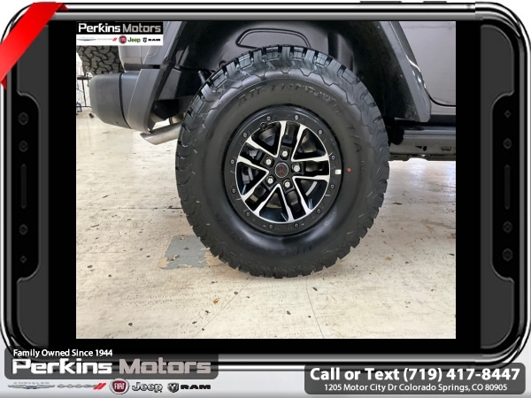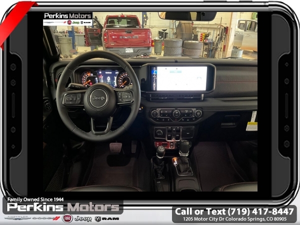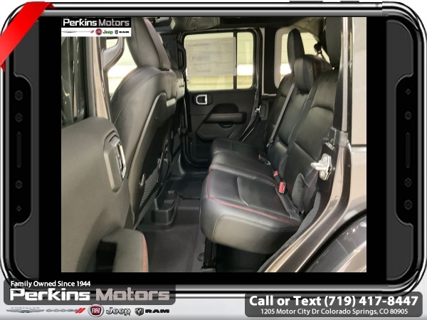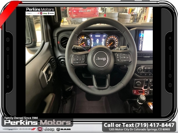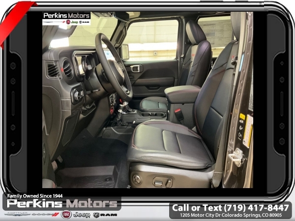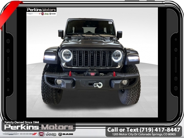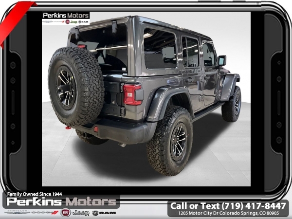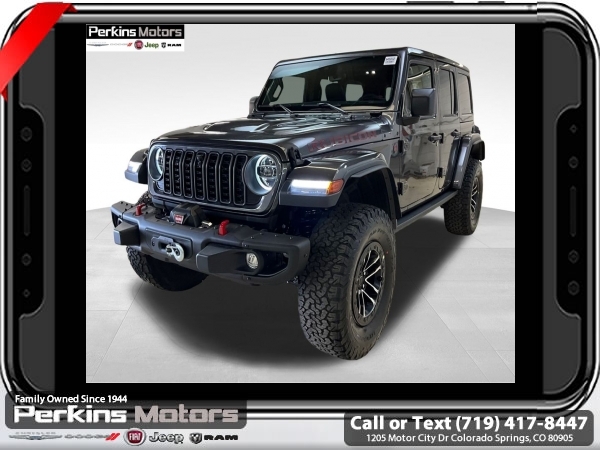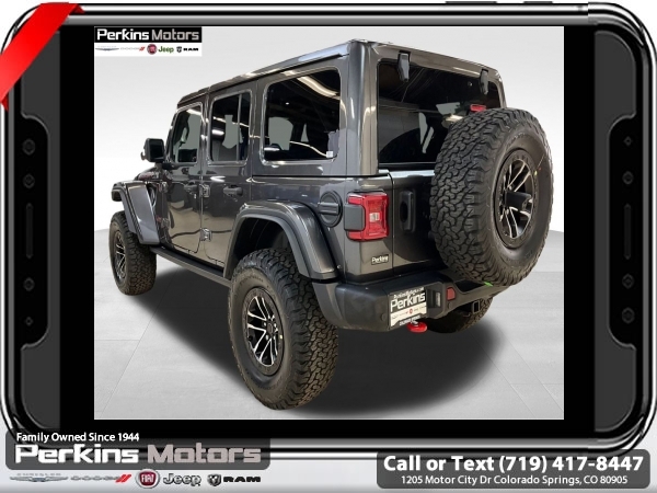 Factory MSRP: $73,265 $8,578 off MSRP! Granite Crystal Metallic Clearcoat 2025 Jeep Wrangler Rubicon X 4WD 8-Speed Automatic 2.0L I4 DOHC<br><br>Check us out at www.perkinsmotors.com to see our specials! Since opening our doors in 1944, we’ve been proud to serve Colorado Springs, CO, and the surrounding areas of Pueblo, Castle Rock and Denver, CO. Throughout this time of being family owned for 80 years, we’ve maintained a firm commitment to our customers: to offer a wide selection of New Chrysler, Dodge, Fiat, Jeep, and Ram vehicles and quality pre-owned vehicles, and provide a quick, no-hassle car-buying process that ensures everyone drives off the lot satisfied with their purchase.<br><br>Convenience Group (Heated Front Seats, Heated Steering Wheel, and Universal Garage Door Opener), Quick Order Package 22Y Rubicon X (Acoustic Front Seat Area Carpet, Acoustic Laminated Front Door Glass, Alpine Premium Audio System, Body Color 3-Piece Hard Top, Body Color Rubicon Highline Flare, Freedom Panel Storage Bag, Leather Wrapped Park Brake Handle, Leather Wrapped Shift Knob, MOPAR Hardtop Headliner, MOPAR Hinge-Gate Reinforcement, Nappa Leather Seats, Power 4-Way Driver Lumbar Adjust, Power 4-Way Passenger Lumbar Adjust, Power Adjust 8-Way Driver Seat, Power Adjust 8-Way Front Passenger Seat, Premium Door Trim Panel, Rear Window Defroster, Rear Window Wiper/Washer, Steel Front Bumper, and Steel Rear Bumper), Safety Group (Auto High Beam Headlamp Control, Blind Spot & Cross Path Detection, and ParkSense Rear Park Assist System), Technology Group (12.3 Touchscreen Display, 4G LTE Wi-Fi Hot Spot, Apple CarPlay, Auto-Dimming Rear-View Mirror, Connected Travel & Traffic Services, Connectivity - US/Canada, Google Android Auto, GPS Navigation, HD Radio, Integrated Off-Road Camera, Integrated Voice Command w/Bluetooth, Radio: Uconnect 5 Nav w/12.3 Display, SiriusXM Radio Service, and SiriusXM w/360L), Trailer Tow & Aux Switch Group (Auxiliary Switches and Class II Receiver Hitch), Trailer Tow Prep Package, Xtreme 35 Tire Package (35 Tire Suspension, 4.56 Rear Axle Ratio, 97 MPH Vehicle Max Speed Calibration, Anti-Lock 4-Wheel Disc Perf Brakes, and Wheels: 17 x 8 Machined w/Black Pockets), 4-Wheel Disc Brakes, 4.10 Rear Axle Ratio, 8 Speakers, ABS brakes, Air Conditioning, Alloy wheels, AM/FM radio: SiriusXM, Apple CarPlay/Android Auto, Automatic temperature control, Aux Battery, Brake assist, Cloth Low-Back Bucket Seats, Compass, Cruise Control, Delay-off headlights, Driver door bin, Driver vanity mirror, Dual front impact airbags, Dual front side impact airbags, Electronic Stability Control, Emergency communication system: Jeep Connect, Front anti-roll bar, Front Bucket Seats, Front Center Armrest w/Storage, Front dual zone A/C, Front fog lights, Front License Plate Bracket (DISC), Front reading lights, Fully automatic headlights, Heated door mirrors, Illuminated entry, Integrated roll-over protection, Jeep Trail Rated Kit, Low tire pressure warning, MOPAR All-Weather Floor Mats, MOPAR Cargo Tub Liner, MOPAR Doors Off Mirror Kit, MOPAR Plastic Door Sill Guards, Non-Lock Fuel Cap w/o Discriminator, Occupant sensing airbag, Outside temperature display, Overhead airbag, Panic alarm, ParkView Rear Back-Up Camera, Passenger door bin, Passenger vanity mirror, Performance Suspension, Power door mirrors, Power steering, Power windows, Radio data system, Radio: Uconnect 5 w/12.3 Display, Rear anti-roll bar, Rear reading lights, Remote keyless entry, Security system, Split folding rear seat, Steering wheel mounted audio controls, Stop-Start Dual Battery System, Tachometer, Telescoping steering wheel, Tilt steering wheel, Traction control, Trip computer, Variably intermittent wipers, Voltmeter, Warn Winch, Wheel Flare Extensions, and Wheels: 17 x 7.5 Machined/Painted Black.