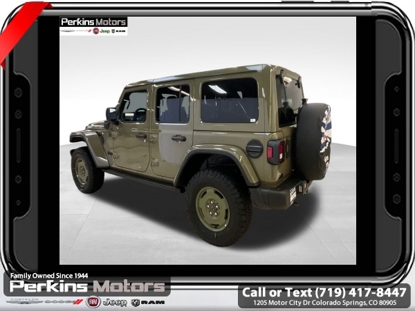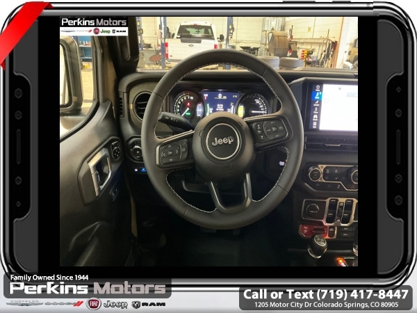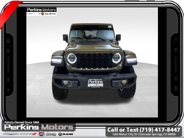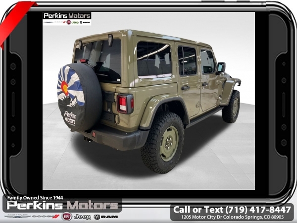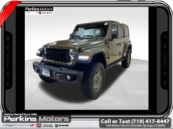 Factory MSRP: $70,305 $14,000 off MSRP! Priced below KBB Fair Purchase Price! 41 2025 Jeep Wrangler Willys 4xe 4WD 8-Speed Automatic 2.0L I4 DOHC<br>2.0L I4 DOHC.<br>Check us out at www.perkinsmotors.com to see our specials! Since opening our doors in 1944, we’ve been proud to serve Colorado Springs, CO, and the surrounding areas of Pueblo, Castle Rock and Denver, CO. Throughout this time of being family owned for 80 years, we’ve maintained a firm commitment to our customers: to offer a wide selection of New Chrysler, Dodge, Fiat, Jeep, and Ram vehicles and quality pre-owned vehicles, and provide a quick, no-hassle car-buying process that ensures everyone drives off the lot satisfied with their purchase.<br><br>Convenience Group (2-Door Passive Entry, Front Door Locks, Heated Steering Wheel, and Universal Garage Door Opener), Quick Order Package 29H Willys '41 4xe (4.10 Rear Axle Ratio, 4xe 4WD Willys '41 Swing Gate Decal, 7 & 4 Pin Wiring Harness, Auxiliary Switches, Front LED Fog Lamps, MOPAR All-Weather Floor Mats, Steel Front Bumper, Steel Rear Bumper, Wheels: 17 x 7.5 Painted Body Color, Willys '41 Retro Edition Buzz Model, Willys '41 Retro Edition PHEV Decal, Willys '41 Retro Edition Wrangler Decal, and Willys '41 US Edition U.S Hood Decal), Trailer Tow & Aux Switch Group, 2.0L I4 DOHC, 3.73 Rear Axle Ratio, 4-Wheel Disc Brakes, 8 Speakers, ABS brakes, Air Conditioning, Alloy wheels, Apple CarPlay/Android Auto, Body Color 3-Piece Hard Top, Brake assist, Cloth Low-Back Bucket Seats, Compass, Cruise Control, Delay-off headlights, Driver door bin, Driver vanity mirror, Dual front impact airbags, Dual front side impact airbags, Electronic Stability Control, Front anti-roll bar, Front Bucket Seats, Front Center Armrest w/Storage, Front fog lights, Front License Plate Bracket (DISC), Front reading lights, Fully automatic headlights, Heated door mirrors, Illuminated entry, Integrated roll-over protection, Jeep Trail Rated Kit, Low tire pressure warning, MOPAR Hardtop Headliner, MOPAR Hinge-Gate Reinforcement, MOPAR Plastic Door Sill Guards, Occupant sensing airbag, Outside temperature display, Overhead airbag, Panic alarm, ParkView Rear Back-Up Camera, Passenger door bin, Passenger vanity mirror, Power door mirrors, Power steering, Power windows, Radio data system, Radio: Uconnect 5 w/12.3 Display, Rear anti-roll bar, Rear reading lights, Rear Window Wiper/Washer, Remote keyless entry, Security system, Split folding rear seat, Sport Suspension, Steering wheel mounted audio controls, Tachometer, Telescoping steering wheel, Tilt steering wheel, Traction control, Trip computer, Variably intermittent wipers, Voltmeter, and Wheels: 20 x 8 Machined/Painted Gray. Sale price includes all manufacture's incentives and dealer discounts. Sale price not available on lease or compatible with special APR. $500 - 2025 National Jeep Celebration Event Bonus Cash . Exp. 04/30/2025 $6500 - 2025 National Retail Consumer Cash. Exp. 04/30/2025