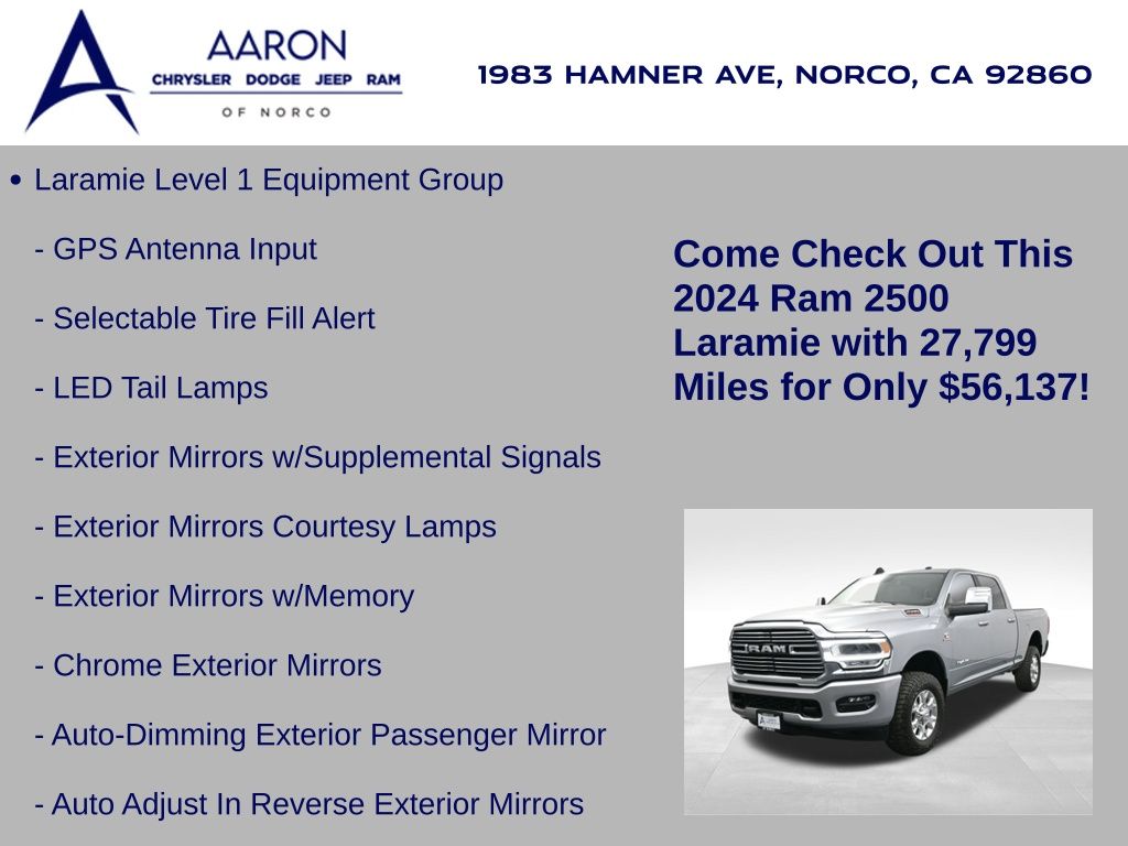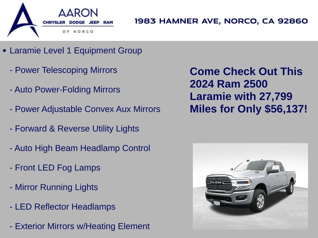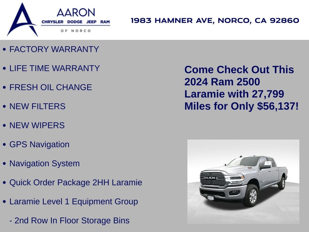 Priced below KBB Fair Purchase Price!FACTORY WARRANTY, LIFE TIME WARRANTY, FRESH OIL CHANGE, NEW FILTERS, NEW WIPERS, 2500 Laramie, 4D Crew Cab, Cummins 6.7L I6 Turbodiesel, 6-Speed Automatic, 4WD, 12" Touchscreen Display, 2nd Row In Floor Storage Bins, 4G LTE Wi-Fi Hot Spot, Alexa Built-In, Alloy wheels, Apple CarPlay, Apple CarPlay/Android Auto, Auto Adjust In Reverse Exterior Mirrors, Auto Dim Exterior Mirror, Auto High Beam Headlamp Control, Auto Power-Folding Mirrors, Auto-Dimming Exterior Passenger Mirror, Blind Spot & Cross Path Detection, Center Hub, Chrome Exterior Mirrors, Connected Travel & Traffic Services, Connectivity - US/Canada, Disassociated Touchscreen Display, Dual front side impact airbags, Exterior Mirrors Courtesy Lamps, Exterior Mirrors w/Heating Element, Exterior Mirrors w/Memory, Exterior Mirrors w/Supplemental Signals, Foam Bottle Insert (Door Trim Panel), For Details, Visit DriveUconnect.com, For More Info, Call 800-643-2112, Forward & Reverse Utility Lights, Front dual zone A/C, Front LED Fog Lamps, Global Telematics Box Module (TBM), Google Android Auto, GPS Antenna Input, GPS Navigation, HD Radio, Heated front seats, Integrated Voice Command w/Bluetooth, Laramie Level 1 Equipment Group, LED Reflector Headlamps, LED Tail Lamps, Mirror Running Lights, Navigation System, Off-Road Information Pages, ParkSense Front/Rear Park Assist System, ParkView Rear Back-Up Camera, Power Adjust Mirrors, Power Adjustable Convex Aux Mirrors, Power Adjustable Pedals w/Memory, Power Heated Fold Telescopic Mirrors w/Memory, Power Telescoping Mirrors, Quick Order Package 2HH Laramie, Radio: Uconnect 5 Nav w/12.0" Display, Rain Sensitive Windshield Wipers, Rear anti-roll bar, Rear Power Sliding Window, Rear Window Defroster, Remote Tailgate Release, Selectable Tire Fill Alert, SiriusXM Radio Service, SiriusXM w/360L, Tow Hooks, Trailer Tow Pages, Wheels: 18" x 8.0" Polished Aluminum.Clean CARFAX.CARFAX One-Owner.