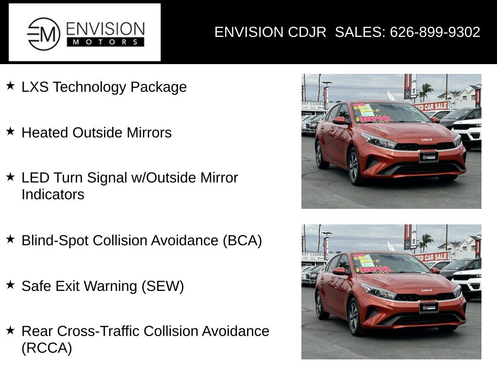 WE SPECIALIZE IN ALL CREDIT PROFILES! See what we can do for you! Call to find out (626) 899-9302.Clean CARFAX.28/39 City/Highway MPG Blind-Spot Collision Avoidance (BCA), Heated Outside Mirrors, LED Turn Signal w/Outside Mirror Indicators, LXS Technology Package, Rear Cross-Traffic Collision Avoidance (RCCA), Safe Exit Warning (SEW).Fire Orange2023 Kia Forte LXS FWD CVT 2.0L I4 MPI**********All Pricing and Advertised Prices for any/all vehicles offered for sale does not include dealer installed accessories which can be purchased for an additional cost.********** The Factory Rebates may not be available on this vehicle if you elect to take advantage of a Special Alternative APR or Special Lease program. Some Factory Rebates are California Resident specific and may vary for residents of other states. NO sales to Dealers, Brokers or Exporters. For out of state purchase, customers must be present to purchase. If shipping is required, dealership must facilitate; no exceptions. Please contact us for special Multi-Vehicle or Fleet pricing. Prices are plus government fees and taxes, any finance charges, $85 documentary fee, $29 electronic registration fee, any emission testing charge and $1.75 per new tire state tire fee. *** We make every effort to provide accurate information, but please verify before purchasing. Leasing & financing available on approved credit. Trade-ins accepted. Subject to prior sale.