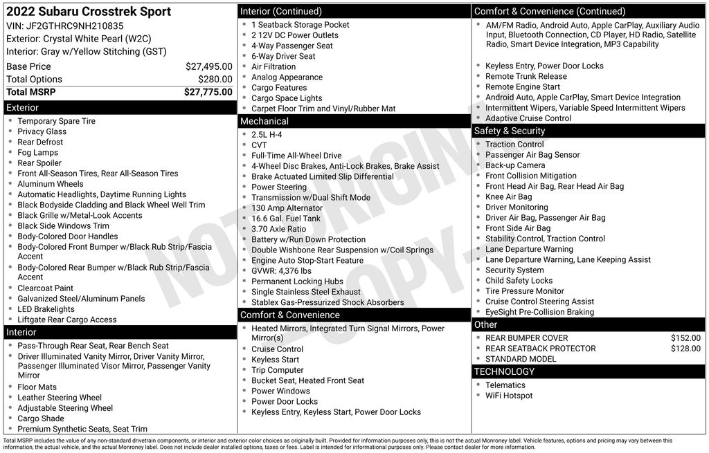 Priced below KBB Fair Purchase Price!FACTORY WARRANTY, LIFE TIME WARRANTY, FRESH OIL CHANGE, NEW FILTERS, NEW WIPERS, Crosstrek Sport, 4D Sport Utility, 2.5L 4-Cylinder DOHC 16V, AWD, Alloy wheels, CD player, Dual front side impact airbags, Exterior Parking Camera Rear, Front fog lights, Heated front seats, Knee airbag, Radio: Subaru STARLINK 6.5" Multimedia Plus System, Spoiler, Subaru STARLINK Smartphone Integration.Clean CARFAX.CARFAX One-Owner.