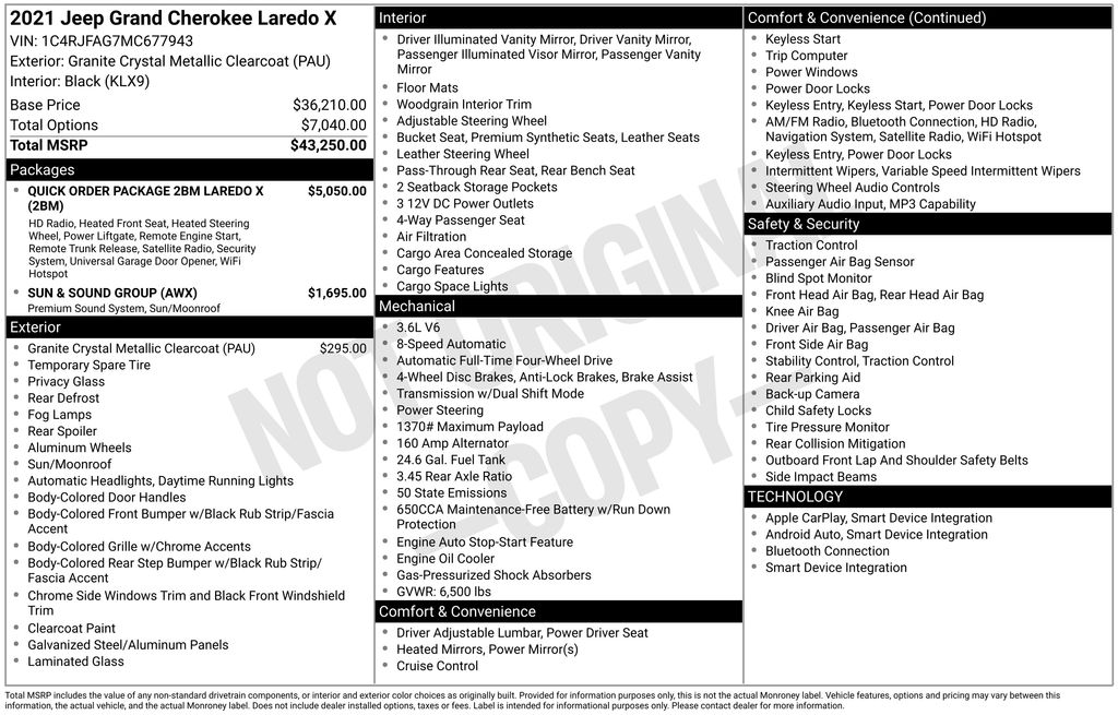 LIFE TIME WARRANTY, FRESH OIL CHANGE, NEW FILTERS, NEW WIPERS, Grand Cherokee Laredo X, 4D Sport Utility, 3.6L V6 24V VVT, 8-Speed Automatic, 4WD, 4G LTE Wi-Fi Hot Spot, 5-Year SiriusXM Traffic Service, 5-Year SiriusXM Travel Link Service, 506 Watt Amplifier, 8.4" Touchscreen Display, Active Noise Control System, Alloy wheels, Apple CarPlay, Black Suede Seats w/Black Stitching, Dual front side impact airbags, Front dual zone A/C, Front fog lights, Google Android Auto, GPS Antenna Input, GPS Navigation, HD Radio, Heated Front Seats, Heated Steering Wheel, Instrument Cluster w/Off-Road Disp. Pages, Integrated Voice Command w/Bluetooth, Knee airbag, ParkView Rear Back-Up Camera, Power Liftgate, Power Sunroof, Premium Alpine Speaker System, Quick Order Package 2BM Laredo X (DISC), Radio: Uconnect 4C Nav w/8.4" Display, Remote Start System, Security Alarm, Spoiler, Steering Wheel Mounted Audio Controls, Sun & Sound Group, Universal Garage Door Opener.Clean CARFAX.CARFAX One-Owner.