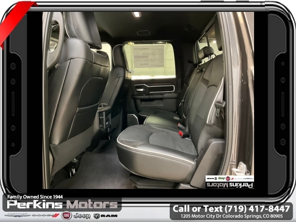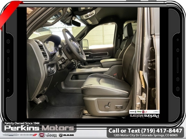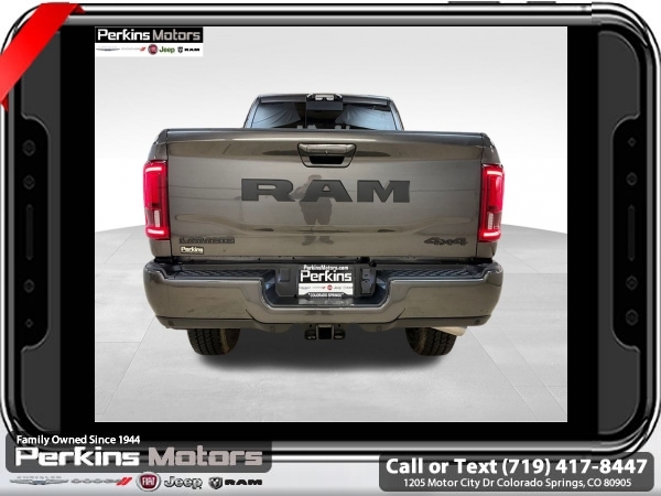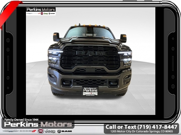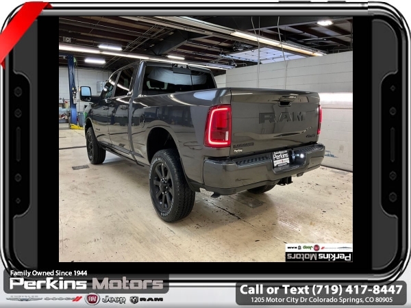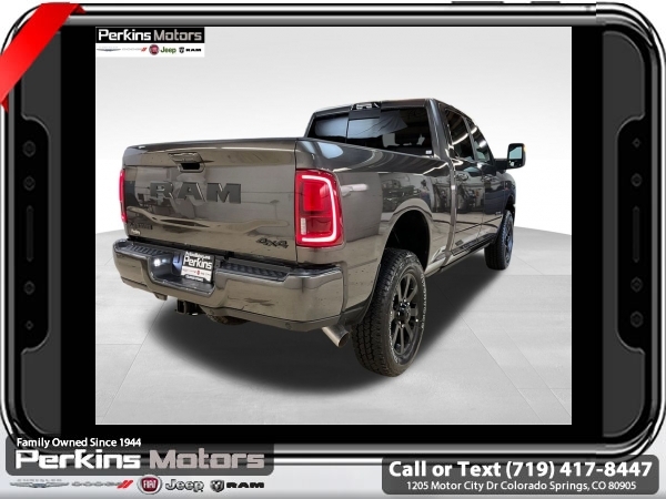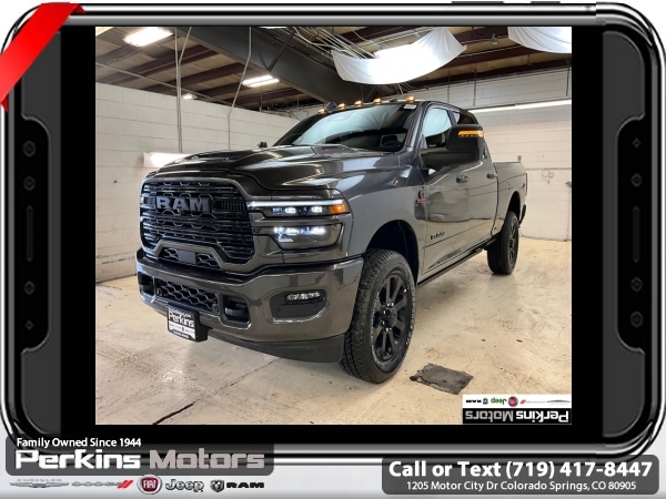 Factory MSRP: $89,875 $1,000 off MSRP! Granite Crystal Metallic Clearcoat 2025 Ram 2500 Laramie 4WD 8-Speed Automatic Cummins 6.7L I6 Turbodiesel<br><br>Check us out at www.perkinsmotors.com to see our specials! Since opening our doors in 1944, we’ve been proud to serve Colorado Springs, CO, and the surrounding areas of Pueblo, Castle Rock and Denver, CO. Throughout this time of being family owned for 80 years, we’ve maintained a firm commitment to our customers: to offer a wide selection of New Chrysler, Dodge, Fiat, Jeep, and Ram vehicles and quality pre-owned vehicles, and provide a quick, no-hassle car-buying process that ensures everyone drives off the lot satisfied with their purchase.<br><br>Laramie Level 2 Plus Equipment Group (#1 Seat Foam Cushion, 115V Auxiliary Rear Power Outlet, 14.4 Touchscreen Display, 17 Speaker harman/kardon Premium Sound, 2 Way Rear Headrest Seat, 2nd Row In Floor Storage Bins, 4 Way Front Headrests, 4G LTE Wi-Fi Hot Spot, Active Lane Management System, Adaptive Steering System, Alexa Built-In, Anti-Spin Differential Rear Axle, Apple CarPlay, Auto Adjust In Reverse Exterior Mirrors, Auto Dim Exterior Mirror, Auto High Beam Headlamp Control, Auto Power-Folding Mirrors, Auto-Dimming Exterior Passenger Mirror, Bucket Seats, Chrome Exterior Mirrors, Connected Travel & Traffic Services, Connectivity - US/Canada, CTR Stop Lamp w/Cargo View Camera, Disassociated Touchscreen Display, Drowsy Driver Detection, Dual Wireless Charging Pad, Emergency Vehicle Alert System (EVAS), Exterior Mirrors Courtesy Lamps, Exterior Mirrors w/Heating Element, Exterior Mirrors w/Memory, Exterior Mirrors w/Supplemental Signals, Foam Bottle Insert (Door Trim Panel), Folding Flat Load Floor Storage, Forward & Reverse Utility Lights, Front Seat Back Map Pockets, Full Length Upgraded Floor Console, Global Telematics Box Module (TBM), Google Android Auto, GPS Antenna Input, GPS Navigation, HD Radio, Heated Front Seats, Heated Second Row Seats, Heated Steering Wheel, High Back Seats, Integrated Voice Command w/Bluetooth, Leather Trimmed Bucket Seats, LED Bed Lighting, Mirror Running Lights, MOPAR Deployable Bed Step, MOPAR Spray In Bedliner, Off-Road Info Pages, Power 2-Way Driver Lumbar Adjust, Power 2-Way Passenger Lumbar Adjust, Power Adjust 8-Way Driver Seat, Power Adjust 8-Way Front Passenger Seat, Power Adjust Mirrors, Power Adjustable Convex Aux Mirrors, Power Adjustable Pedals w/Memory, Power Deployable Running Boards, Power Heated Fold Telescopic Mirrors w/Memory, Power Telescoping Mirrors, Radio: Uconnect 5 Nav w/14.4 Display, Rain Sensitive Windshield Wipers, Rear 60/40 Folding Seat, Remote Tailgate Release, Selectable Tire Fill Alert, SiriusXM Radio Service, SiriusXM w/360L, Traffic Sign Recognition, and Trailer Tow Pages), Night Edition (Black Exterior Mirrors, Black Exterior Truck Badging, Black Wheel Center Hub, Body Color Grille Surround, Gloss Black Grille Billets/Accents, Sport Performance Hood, and Wheels: 20 x 8.0 Black Painted Aluminum), Quick Order Package 24H Laramie, Towing Technology Group (Surround View Camera System, Trailer Reverse Guidance, and Trailer Tire Pressure Monitoring System), 10 Speakers, 3.42 Axle Ratio, 3.73 Axle Ratio, 4-Wheel Disc Brakes, 5th Wheel/Gooseneck Towing Prep Group, ABS brakes, Air Conditioning, Alloy wheels, AM/FM radio: SiriusXM with 360L, Apple CarPlay/Android Auto, Auto-dimming Rear-View mirror, Automatic temperature control, Brake assist, Bumpers: body-color, Clearance Lamps, Compass, Cruise Control, Dash Pass Thru Wire Circuits, Delay-off headlights, Driver door bin, Driver vanity mirror, Dual front impact airbags, Dual front side impact airbags, Electronic Stability Control, Engine Block Heater, Front anti-roll bar, Front Center Armrest w/Storage, Front dual zone A/C, Front fog l Sale price includes all manufacture's incentives and dealer discounts. Sale price not available on lease or compatible with special APR. $1000 - 2025 National Bonus Cash . Exp. 0