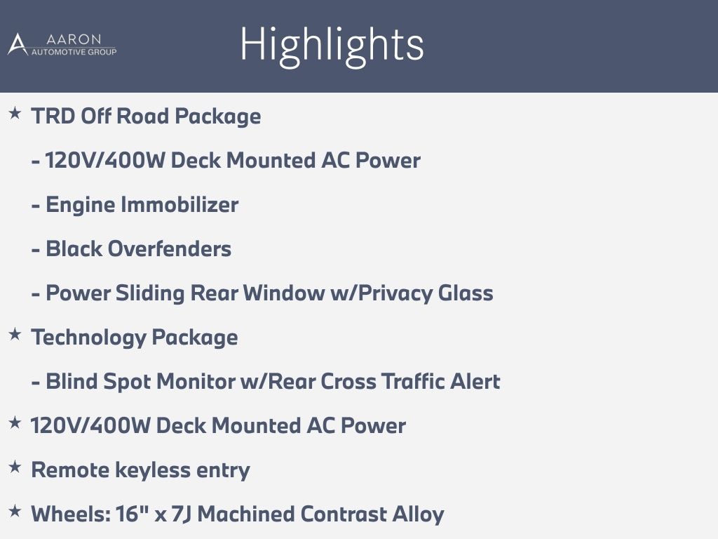Magnetic Gray Metallic 2022 Toyota Tacoma TRD Off-Road V6 4WD 6-Speed Automatic 3.5L V6 PDI DOHC 24V LEV3-ULEV70 278hp 4WD, 120V/400W Deck Mounted AC Power, Air Conditioning, Apple CarPlay/Android Auto, Black Overfenders, Blind Spot Monitor w/Rear Cross Traffic Alert, Color-Keyed Rear Bumper, Engine Immobilizer, Exterior Parking Camera Rear, Front Bucket Seats, Front fog lights, LED Daytime Running Lights & Fog Lights, Mesh Front Grille, Power Sliding Rear Window w/Privacy Glass, Rear Parking Assist Sonar, Remote keyless entry, Smart Key w/Push Button Start, Speed control, Technology Package, TRD Off Road Package, Wheels: 16" x 7J Machined Contrast Alloy.Recent Arrival!