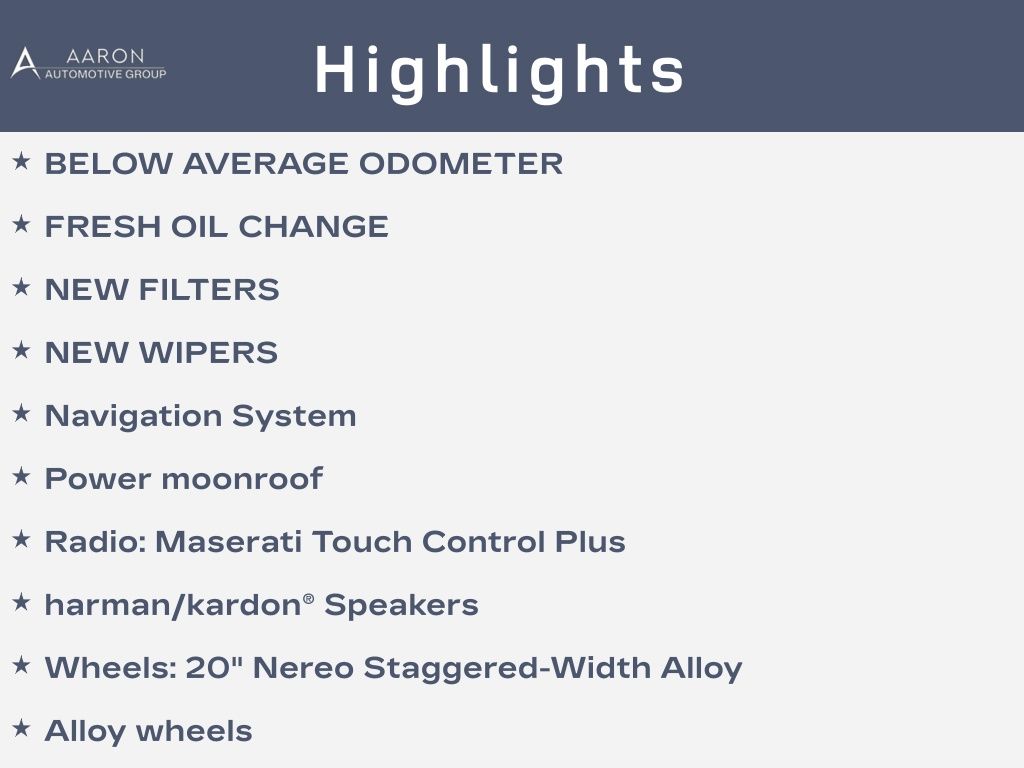 Priced below KBB Fair Purchase Price!BELOW AVERAGE ODOMETER, FRESH OIL CHANGE, NEW FILTERS, NEW WIPERS, Levante S GranSport, 4D Sport Utility, 3.0L V6, ZF 8-Speed Automatic, AWD, Alloy wheels, Apple CarPlay/Android Auto, Dual front side impact airbags, Exterior Parking Camera Rear, Front dual zone A/C, Front fog lights, harman/kardon® Speakers, Memory seat, Navigation System, Overhead airbag, Power Liftgate, Power moonroof, Radio: Maserati Touch Control Plus, Roof rack: rails only, Spoiler, Wheels: 20" Nereo Staggered-Width Alloy.Clean CARFAX.