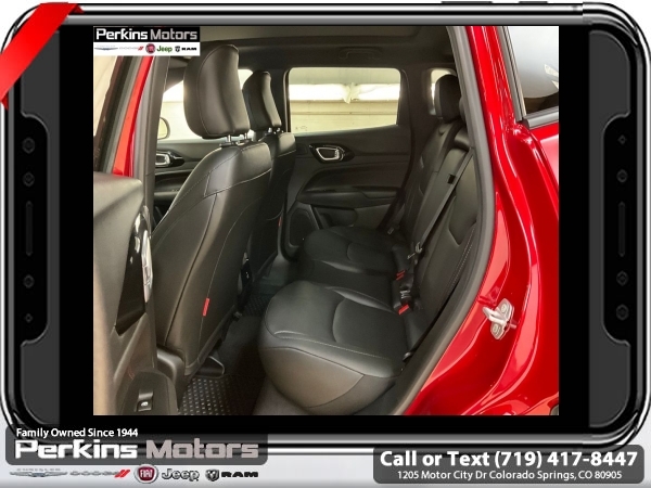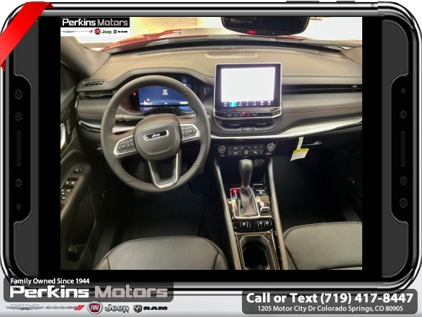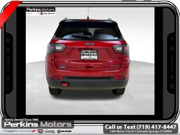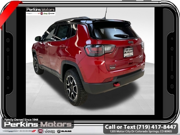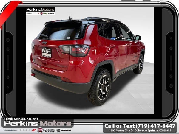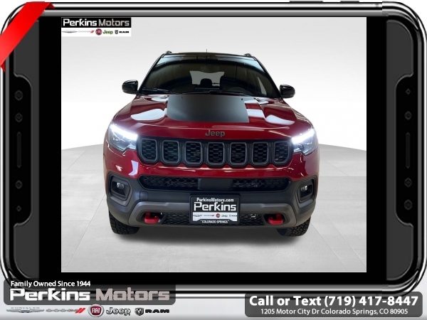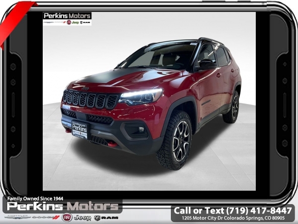 Factory MSRP: $41,835 $5,000 off MSRP! Red Hot Pearlcoat 2025 Jeep Compass Trailhawk 4WD 8-Speed Automatic 2.0L I4 DOHC<br>4WD.<br>Check us out at www.perkinsmotors.com to see our specials! Since opening our doors in 1944, we’ve been proud to serve Colorado Springs, CO, and the surrounding areas of Pueblo, Castle Rock and Denver, CO. Throughout this time of being family owned for 80 years, we’ve maintained a firm commitment to our customers: to offer a wide selection of New Chrysler, Dodge, Fiat, Jeep, and Ram vehicles and quality pre-owned vehicles, and provide a quick, no-hassle car-buying process that ensures everyone drives off the lot satisfied with their purchase.<br><br>Quick Order Package 29E, Sun and Sound Group (Power Front/Fixed Rear Full Sunroof and Premium Alpine Speaker System), Trailhawk Elite Group (10.1 Touchscreen Display, 2nd Row USB Type A/C Charge Only, Alexa Built-In, Cluster 10.25 TFT Color Display, Connected Travel & Traffic Services, Driver Seat Memory, Foot Activated Open 'N Go Liftgate, GPS Navigation, HD Radio, Heated Front Seats, Heated Steering Wheel, Integrated Voice Command w/Bluetooth, LED Low/Highbeam Projector Headlamps, Power 2-Way Driver Lumbar Adjust, Power 2-Way Passenger Lumbar Adjust, Power 8-Way Adjust Front Passenger Seat, Power Adjust 8-Way Driver Seat, Power Liftgate, Premium Leather Trimmed Bucket Seats, Premium LED Fog Lamps, Premium Taillamps, Remote Start System, Reversible Carpet/Vinyl Cargo Mat, SiriusXM w/360L, Ventilated Front Seats, and Windshield Wiper De-Icer), 4WD, 4-Wheel Disc Brakes, 4.398 Final Drive Ratio, 6 Speakers, ABS brakes, Air Conditioning, Alloy wheels, AM/FM radio: SiriusXM, Auto High-beam Headlights, Auto-dimming Rear-View mirror, Automatic temperature control, Brake assist, Bumpers: body-color, Compass, Cruise Control, Delay-off headlights, Driver door bin, Driver vanity mirror, Dual front impact airbags, Dual front side impact airbags, Electronic Stability Control, Emergency communication system: Jeep Connect, Four wheel independent suspension, Front anti-roll bar, Front Bucket Seats, Front Center Armrest w/Storage, Front dual zone A/C, Front fog lights, Front License Plate Bracket, Front reading lights, Fully automatic headlights, Heated door mirrors, Illuminated entry, Knee airbag, Leather Shift Knob, Leather steering wheel, Low tire pressure warning, Occupant sensing airbag, Outside temperature display, Overhead airbag, Overhead console, Panic alarm, ParkView Rear Back-Up Camera, Passenger door bin, Passenger vanity mirror, Power door mirrors, Power steering, Power windows, Premium Cloth/Leather Trim Bucket Seats, Radio: Uconnect 5 w/10.1 Display, Rain sensing wipers, Rear anti-roll bar, Rear seat center armrest, Rear window defroster, Rear window wiper, Remote keyless entry, Security system, Split folding rear seat, Spoiler, Steering wheel mounted audio controls, Tachometer, Telescoping steering wheel, Tilt steering wheel, Traction control, Trip computer, Turn signal indicator mirrors, Variably intermittent wipers, and Wheels: 17 x 6.5 Painted Black Aluminum.<br><br>24/32 City/Highway MPG Sale price includes all manufacture's incentives and dealer discounts. Sale price not available on lease or compatible with special APR. $1500 - 2025 National Jeep Celebration Event Retail Bonus Cash . Exp. 04/30/2025 $500 - 2025 National Retail Consumer Cash. Exp. 04/30/2025