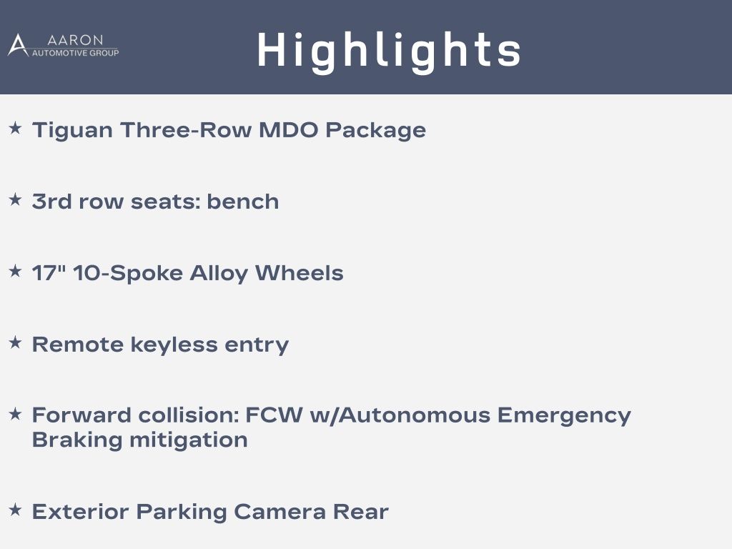 Priced below KBB Fair Purchase Price!17" 10-Spoke Alloy Wheels, 3-Row Rubber Monster Mats w/Logo Kit (Set of 5), 3rd row seats: bench, Cargo Area Retractable Privacy Cover, Exterior Parking Camera Rear, Forward collision: FCW w/Autonomous Emergency Braking mitigation, Frameless Auto-Dimming Rearview Mirror, Heavy Duty Trunk Liner w/VW CarGo Blocks, Remote keyless entry, Tiguan Three-Row MDO Package, VW App-Connect (w/Apple CarPlay, Android Auto & MirrorLink).22/29 City/Highway MPGCARFAX One-Owner.Clean CARFAX.To see more quality vehicles like this one right just click on AaronFordofPoway.com or dial (858) 748-1400.