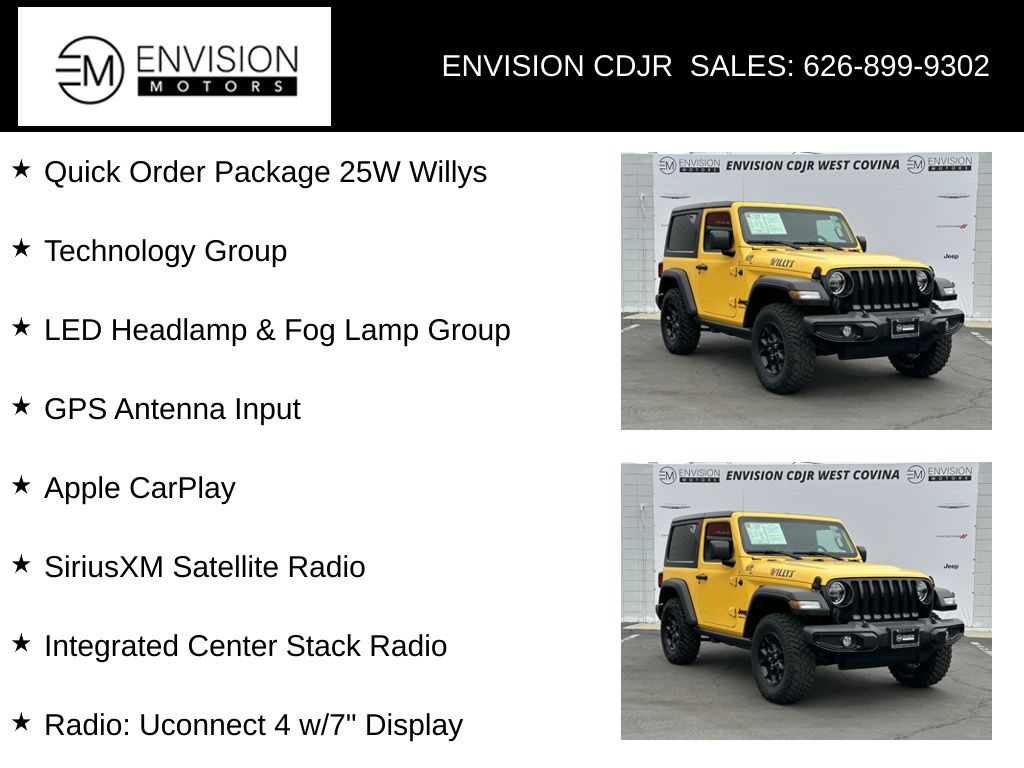 WE SPECIALIZE IN ALL CREDIT PROFILES! See what we can do for you! Call to find out (626) 899-9302.Certified. Clean CARFAX.Odometer is 11560 miles below market average! 4-Wheel Drive Swing Gate Decal, 7.0" Touchscreen Display, 97 MPH Vehicle Max Speed Calibration, Air Conditioning, Air Conditioning w/Auto Temperature Control, Air Filtering, Anti-Spin Differential Rear Axle, Apple CarPlay, Automatic Headlamps, Black 3-Piece Hard Top, Black Grille, Black Trail Rated Badge, Cluster 7.0" TFT Color Display, Deep Tint Sunscreen Windows, For More Info Call 800-643-2112, Freedom Panel Storage Bag, Front 1-Touch Down Power Windows, Front LED Fog Lamps, Google Android Auto, GPS Antenna Input, Integrated Center Stack Radio, Leather Wrapped Steering Wheel, LED Headlamp & Fog Lamp Group, LED Premium Reflector Headlamps, Matte Black Jeep Badge, Mold In Color Bumper w/Gloss Black, MOPAR All-Weather Floor Mats, No Soft Top, Power Heated Mirrors, Quick Order Package 25W Willys, R1234YF A/C Refrigerant, Radio: Uconnect 4 w/7" Display, Rear Window Defroster, Rear Window Wiper/Washer, Remote Keyless Entry, Security Alarm, SiriusXM Radio Service, SiriusXM Satellite Radio, Speed Sensitive Power Locks, Sun Visors w/Illuminated Vanity Mirrors, Technology Group, USB Host Flip, Wheels: 17" x 7.5" Moab Black Aluminum, Willys, Willys Hood Decal, Wrangler Decal.Baja Yellow Clearcoat2021 Jeep Wrangler Willys 4WD 8-Speed Automatic 3.6L V6 24V VVTFCA US LLC Certified Pre-Owned Details: * Limited Warranty: 3 Month/3,000 Mile (whichever comes first) after new car warranty expires or from certified purchase date * Transferable Warranty * Warranty Deductible: $100 * Includes First Day Rental, Car Rental Allowance, and Trip Interruption Benefits. SiriusXM 3 month trial subscription * Vehicle History * Roadside Assistance * Powertrain Limited Warranty: 84 Month/100,000 Mile (whichever comes first) from original in-service date * 125 Point Inspection**********All Pricing and Advertised Prices for any/all vehicles offered for sale does not include dealer installed accessories which can be purchased for an additional cost.********** The Factory Rebates may not be available on this vehicle if you elect to take advantage of a Special Alternative APR or Special Lease program. Some Factory Rebates are California Resident specific and may vary for residents of other states. NO sales to Dealers, Brokers or Exporters. For out of state purchase, customers must be present to purchase. If shipping is required, dealership must facilitate; no exceptions. Please contact us for special Multi-Vehicle or Fleet pricing. Prices are plus government fees and taxes, any finance charges, $85 documentary fee, $29 electronic registration fee, any emission testing charge and $1.75 per new tire state tire fee. *** We make every effort to provide accurate information, but please verify before purchasing. Leasing & financing available on approved credit. Trade-ins accepted. Subject to prior sale.