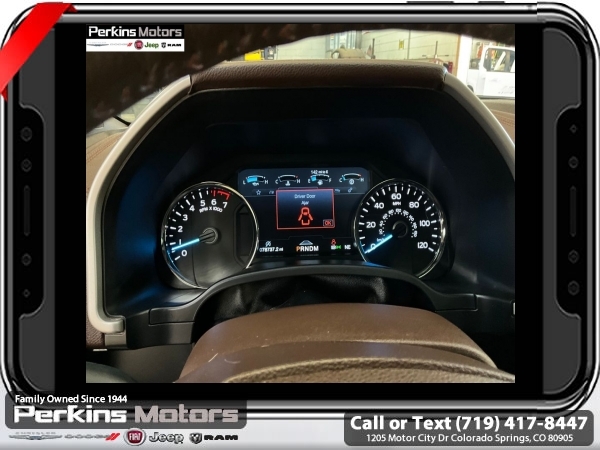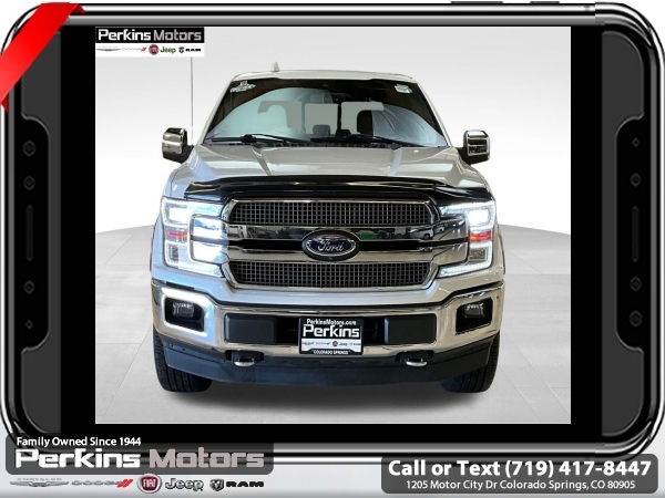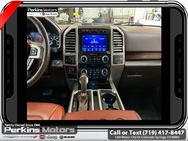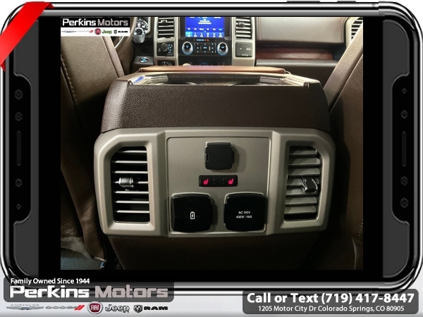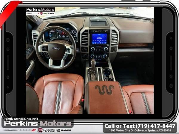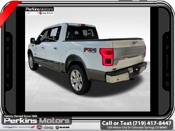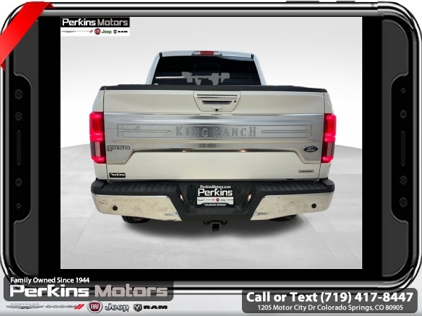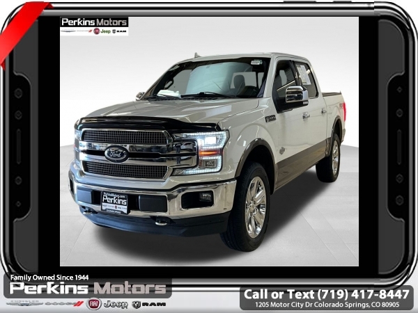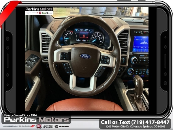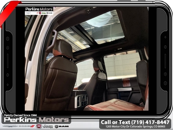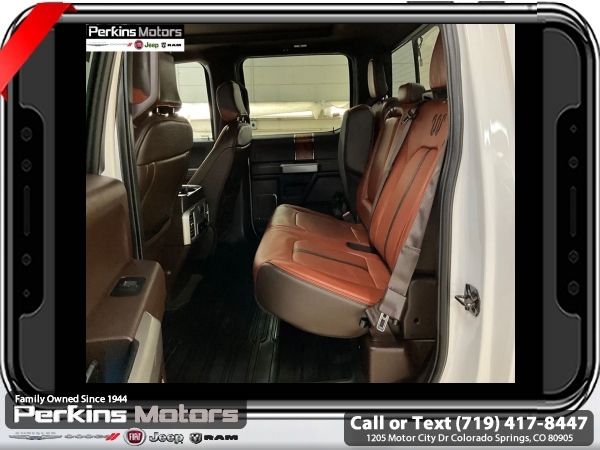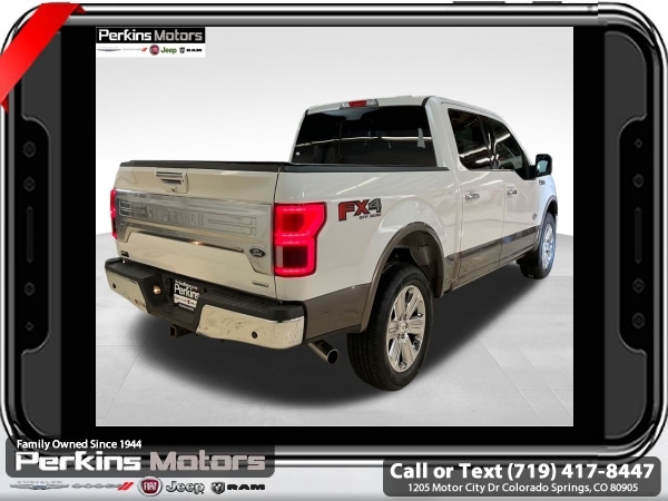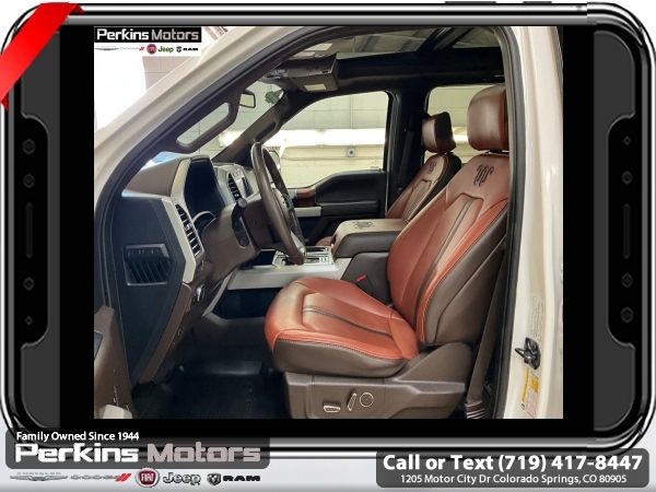Star White Metallic Tri-Coat 4WD 3.5L V6 EcoBoost 10-Speed Automatic<br><br>4WD, 20 Machined-Aluminum Wheels, 360 Camera w/Split-View Display, 4x4 FX4 Off-Road Bodyside Decal, Active Park Assist, Bright Belt Moldings, Chrome Door Handles w/Body-Color Strap, Chrome Skull Caps on Exterior Mirrors, Class IV Trailer Hitch Receiver, Electronic Locking w/3.55 Axle Ratio, Engine Oil Cooler, Equipment Group 601A Luxury, Extended Range 36 Gallon Fuel Tank, Front & Rear Chrome Bumpers, FX4 Off-Road Package, Hill Descent Control, Inflatable Rear Safety Belts, Integrated Trailer Brake Controller, King Ranch Chrome Appearance Package, Max Trailer Tow Package, Multi-Contour Driver & Passenger Seats, Off-Road Tuned Front Shock Absorbers, Power-Deployable Running Boards, Pro Trailer Backup Assist, Tailgate Step w/Tailgate Lift Assist, Technology Package, Tray Style Floor Liner, Twin Panel Moonroof, Upgraded Front Stabilizer Bar, Wheels: 20 Chrome-Like PVD.<br><br><br>CARFAX One-Owner. Clean CARFAX.<br><br>Check us out at www.perkinsmotors.com to see our specials! Since opening our doors in 1944, we’ve been proud to serve Colorado Springs, CO, and the surrounding areas of Pueblo, Castle Rock and Denver, CO. Throughout this time of being family owned for 80 years, we’ve maintained a firm commitment to our customers: to offer a wide selection of New Chrysler, Dodge, Fiat, Jeep, and Ram vehicles and quality pre-owned vehicles, and provide a quick, no-hassle car-buying process that ensures everyone drives off the lot satisfied with their purchase.<br><br><br>Equipment Group 601A Luxury (20 Machined-Aluminum Wheels, Inflatable Rear Safety Belts, Multi-Contour Driver & Passenger Seats, Power-Deployable Running Boards, and Tailgate Step w/Tailgate Lift Assist), FX4 Off-Road Package (4x4 FX4 Off-Road Bodyside Decal, Hill Descent Control, Off-Road Tuned Front Shock Absorbers, and Tray Style Floor Liner), King Ranch Chrome Appearance Package (Bright Belt Moldings, Chrome Door Handles w/Body-Color Strap, Chrome Skull Caps on Exterior Mirrors, Front & Rear Chrome Bumpers, and Wheels: 20 Chrome-Like PVD), Max Trailer Tow Package (Class IV Trailer Hitch Receiver, Electronic Locking w/3.55 Axle Ratio, Engine Oil Cooler, Extended Range 36 Gallon Fuel Tank, Integrated Trailer Brake Controller, Pro Trailer Backup Assist, and Upgraded Front Stabilizer Bar), Technology Package (360 Camera w/Split-View Display and Active Park Assist), 4WD, Twin Panel Moonroof, 10 Speakers, 18 Machined-Aluminum Wheels, 4-Wheel Disc Brakes, ABS brakes, Adaptive Cruise Control, Adjustable pedals, Air Conditioning, Alloy wheels, AM/FM radio: SiriusXM, Auto High-beam Headlights, Auto tilt-away steering wheel, Auto-dimming door mirrors, Auto-dimming Rear-View mirror, Automatic temperature control, Brake assist, Compass, Cruise Control, Delay-off headlights, Driver door bin, Driver vanity mirror, Dual front impact airbags, Dual front side impact airbags, Electronic Stability Control, Emergency communication system: SYNC 3 911 Assist, Engine Block Heater, Exterior Parking Camera Rear, Front anti-roll bar, Front Bucket Seats, Front Center Armrest, Front dual zone A/C, Front fog lights, Front License Plate Bracket, Front reading lights, Front wheel independent suspension, Fully automatic headlights, Garage door transmitter, Genuine wood dashboard insert, Genuine wood door panel insert, Heated door mirrors, Heated front seats, Heated rear seats, Heated steering wheel, Illuminated entry, King Ranch Leather Bucket Seats, LED Sideview Mirror Spotlights, Low tire pressure warning, Memory seat, Navigation System, Occupant sensing airbag, Outside temperature display, Overhead airbag, Overhead console, Panic alarm, Passenger door bin, Passenger vanity mirror, Pedal memory, Power door mirrors, Power driver seat, Power passenger seat, Power steering, Power windows, Radio data system, Radio: B&O Sound System by Bang & Olufsen, Rain sensing wipers, Rear Parking Sensors, Rear reading lights, Re