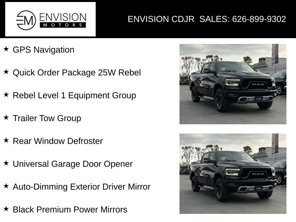 WE SPECIALIZE IN ALL CREDIT PROFILES! See what we can do for you! Call to find out (626) 899-9302.Certified. CARFAX One-Owner. Clean CARFAX.Odometer is 13192 miles below market average! Auto-Dimming Exterior Driver Mirror, Black Premium Power Mirrors, Exterior Mirrors Courtesy Lamps, Exterior Mirrors w/Supplemental Signals, Foam Bottle Insert (Door Trim Panel), GPS Navigation, Heated Front Seats, Heated Steering Wheel, Power Adjustable Pedals, Power-Folding Mirrors, Quick Order Package 25W Rebel, Rear Dome w/On/Off Switch Lamp, Rear Window Defroster, Rebel Level 1 Equipment Group, Sun Visors w/Illuminated Vanity Mirrors, Trailer Brake Control, Trailer Light Check, Trailer Reverse Steering Control, Trailer Tire Pressure Monitoring System, Trailer Tow Group, Universal Garage Door Opener, Wheels: 18" x 8.0" Painted Mid-Gloss Black.Diamond Black Crystal Pearlcoat2021 Ram 1500 Rebel 4WD 8-Speed Automatic HEMI 5.7L V8 Multi Displacement VVTFCA US LLC Certified Pre-Owned Details: * Warranty Deductible: $100 * Includes First Day Rental, Car Rental Allowance, and Trip Interruption Benefits. SiriusXM 3 month trial subscription. * Transferable Warranty * 125 Point Inspection * Roadside Assistance * Limited Warranty: 3 Month/3,000 Mile (whichever comes first) after new car warranty expires or from certified purchase date * Powertrain Limited Warranty: 84 Month/100,000 Mile (whichever comes first) from original in-service date * Vehicle History**********All Pricing and Advertised Prices for any/all vehicles offered for sale does not include dealer installed accessories which can be purchased for an additional cost.********** The Factory Rebates may not be available on this vehicle if you elect to take advantage of a Special Alternative APR or Special Lease program. Some Factory Rebates are California Resident specific and may vary for residents of other states. NO sales to Dealers, Brokers or Exporters. For out of state purchase, customers must be present to purchase. If shipping is required, dealership must facilitate; no exceptions. Please contact us for special Multi-Vehicle or Fleet pricing. Prices are plus government fees and taxes, any finance charges, $85 documentary fee, $29 electronic registration fee, any emission testing charge and $1.75 per new tire state tire fee. *** We make every effort to provide accurate information, but please verify before purchasing. Leasing & financing available on approved credit. Trade-ins accepted. Subject to prior sale.Awards: * Motor Trend Automobiles of the year * JD Power Automotive Performance, Execution and Layout (APEAL) Study