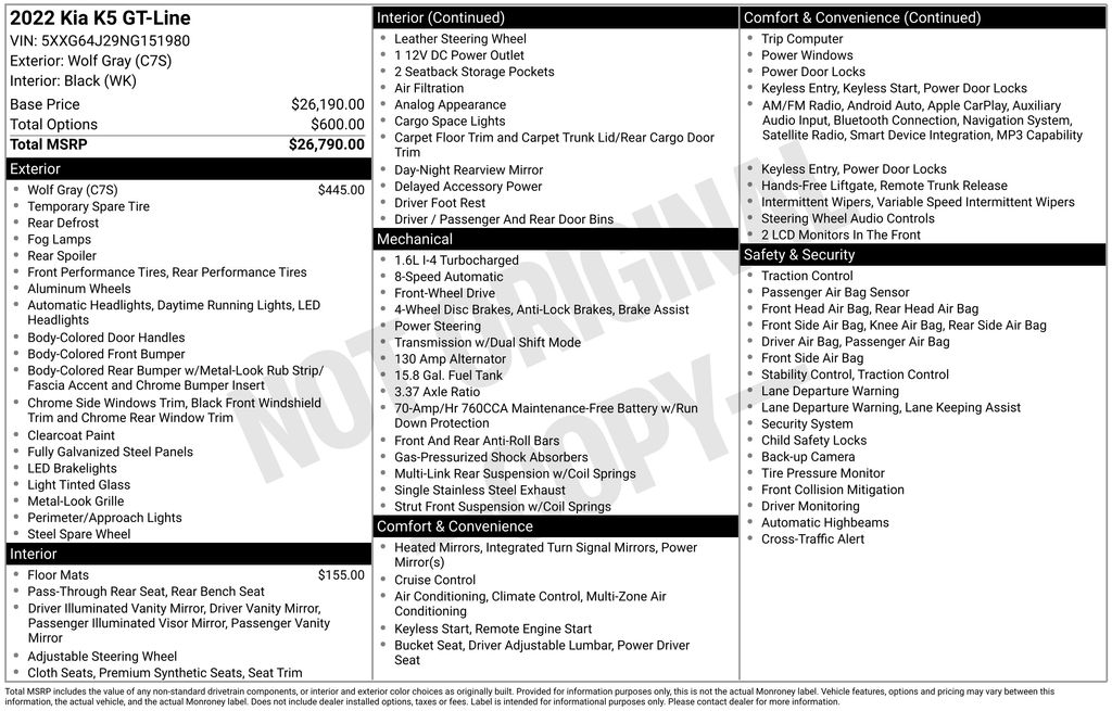 Priced below KBB Fair Purchase Price!FACTORY WARRANTY, LIFE TIME WARRANTY, BELOW AVERAGE ODOMETER, FRESH OIL CHANGE, NEW FILTERS, NEW WIPERS, K5 GT-Line, 4D Sedan, I4, 8-Speed Automatic, FWD, Alloy wheels, Apple CarPlay & Android Auto, Cloth/Leatherette Seat Trim, Dual front side impact airbags, Front dual zone A/C, Front fog lights, Knee airbag, Navigation System, Overhead airbag, Sport steering wheel, Wheels: 7.5J x 18" Gloss Black Machined Finish Alloy.CARFAX One-Owner.