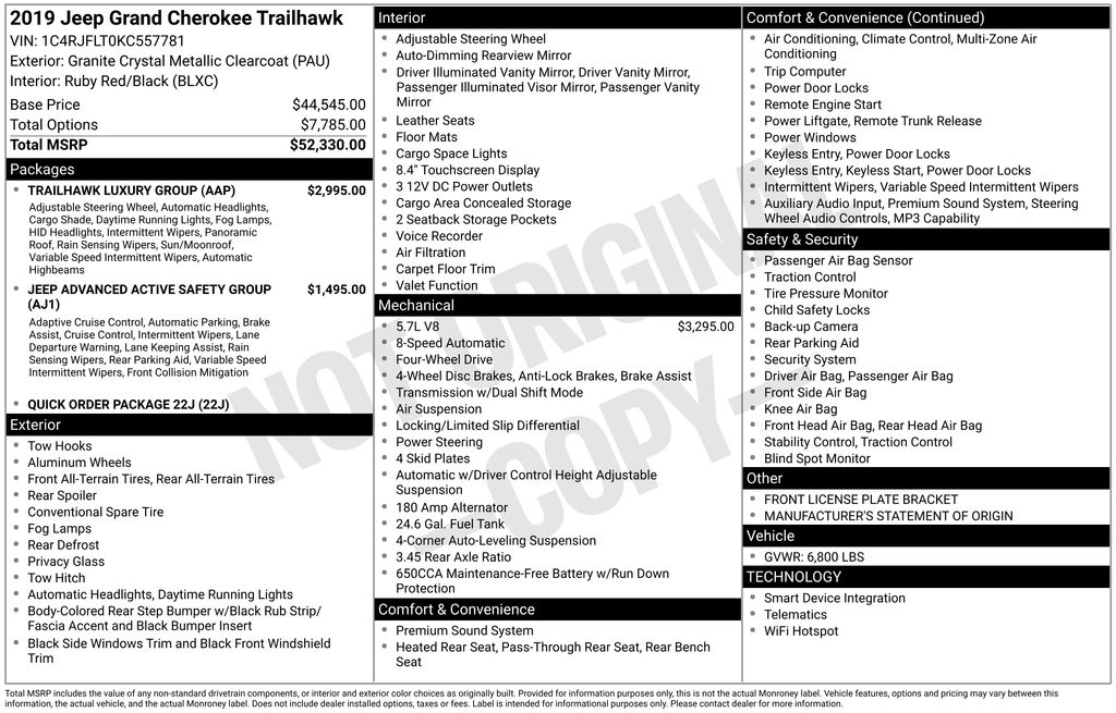 4WD, 8.4" Touchscreen Display, Adaptive Cruise Control w/Stop, Advanced Brake Assist, Auto High Beam Headlamp Control, Bi-Xenon High-Intensity Discharge Headlamps, Cargo Compartment Cover, Dual-Pane Panoramic Sunroof, Front LED Fog Lamps, Full Speed FWD Collision Warn Plus, Heated front seats, Heated rear seats, Heated steering wheel, Jeep Advanced Active Safety Group, Lane Departure Warning Plus, LED Daytime Running Headlamps, Navigation System, Parallel & Perp Park Assist w/Stop, ParkView Rear Back-Up Camera, Power Liftgate, Power Tilt/Telescope Steering Column, Quadra-Trac II 4WD System, Quick Order Package 22J, Radio: Uconnect 4C Nav w/8.4" Display, Rain Sensitive Windshield Wipers, Remote keyless entry, Trailhawk Leather Trim Seats w/Perforation, Trailhawk Luxury Group, Wheels: 18" x 8.0" Off Road Aluminum.Clean CARFAX.To see more quality vehicles like this one right just click on AaronFordofPoway.com or dial (858) 748-1400.