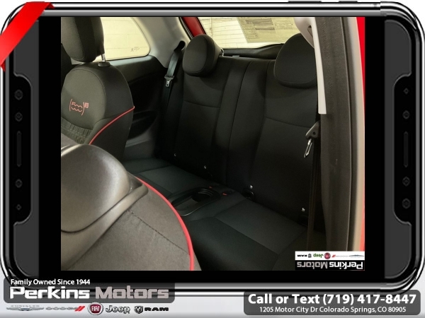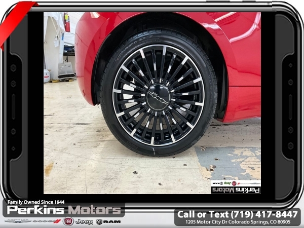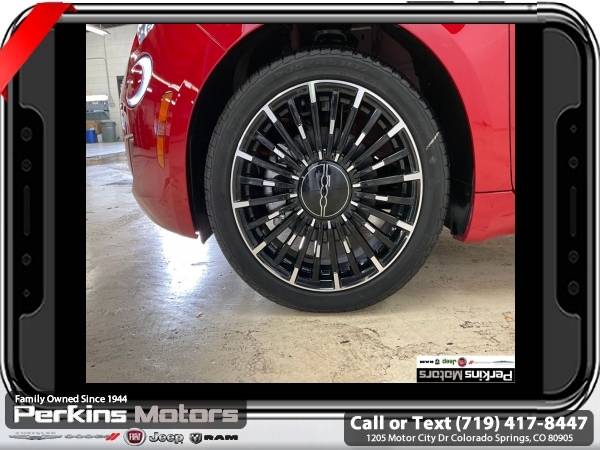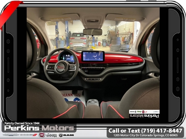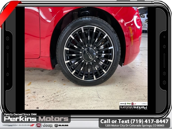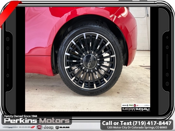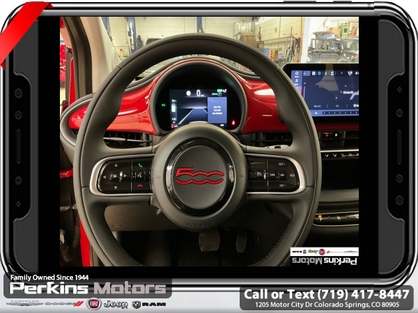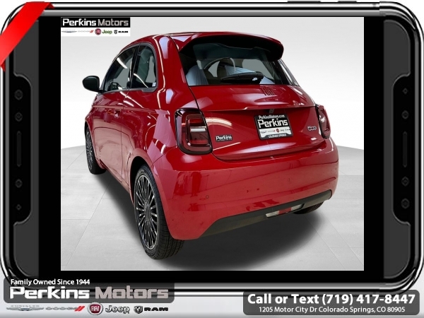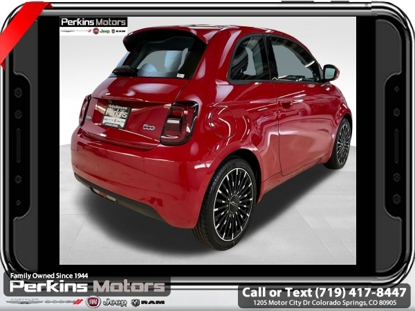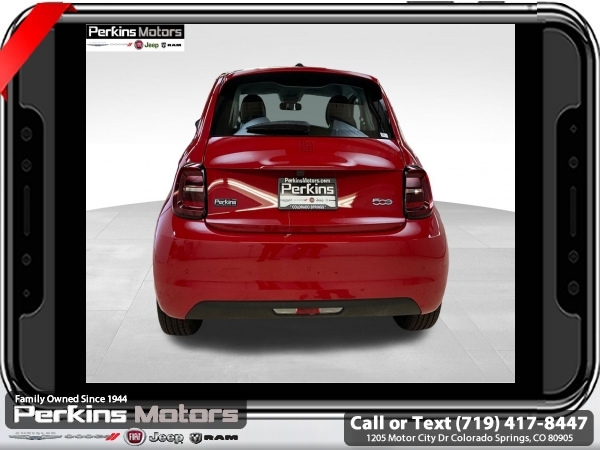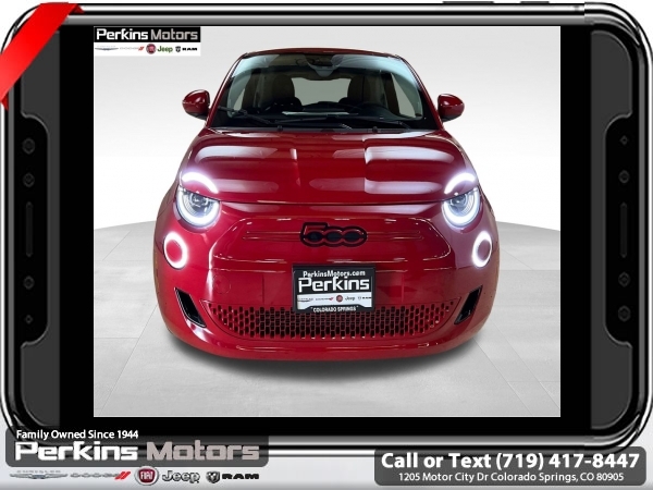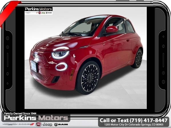 Factory MSRP: $34,095 $2,499 off MSRP! Red by (Red) 2024 Fiat 500e Battery Electric FWD 1-Speed Automatic Electric<br><br>Check us out at www.perkinsmotors.com to see our specials! Since opening our doors in 1944, we’ve been proud to serve Colorado Springs, CO, and the surrounding areas of Pueblo, Castle Rock and Denver, CO. Throughout this time of being family owned for 80 years, we’ve maintained a firm commitment to our customers: to offer a wide selection of New Chrysler, Dodge, Fiat, Jeep, and Ram vehicles and quality pre-owned vehicles, and provide a quick, no-hassle car-buying process that ensures everyone drives off the lot satisfied with their purchase.<br><br>Quick Order Package 21A 500e Inspi(red), 6 Speakers, ABS brakes, Air Conditioning, Alloy wheels, AM/FM radio: SiriusXM, Anti-whiplash front head restraints, Automatic temperature control, Brake assist, Bumpers: body-color, Cloth Bucket Seats w/Red Accents, Compass, Cruise Control, Delay-off headlights, Driver door bin, Dual front impact airbags, Dual front side impact airbags, Electronic Stability Control, Front anti-roll bar, Front Bucket Seats, Front Center Armrest, Front dual zone A/C, Front reading lights, Front wheel independent suspension, Fully automatic headlights, Illuminated entry, Knee airbag, Low tire pressure warning, Manufacturer's Statement of Origin, Navigation System, Occupant sensing airbag, Outside temperature display, Overhead airbag, Overhead console, Panic alarm, ParkView Rear Back-Up Camera, Passenger door bin, Passenger vanity mirror, Power door mirrors, Power steering, Power windows, Premium audio system: Uconnect 5.0, Radio data system, Radio: Uconnect 5 Nav w/10.25 Display, Rain sensing wipers, Rear anti-roll bar, Rear window defroster, Rear window wiper, Remote keyless entry, Security system, Split folding rear seat, Spoiler, Sport steering wheel, Steering wheel mounted audio controls, Telescoping steering wheel, Tilt steering wheel, Traction control, Trip computer, Variably intermittent wipers, and Wheels: 17 x 7.0 Aluminum Multi-Spoke. Sale price includes all manufacture's incentives and dealer discounts. Sale price not available on lease or compatible with special APR. $1499 - 2024 National Minimum Employee Pricing Discount . Exp. 06/02/2025