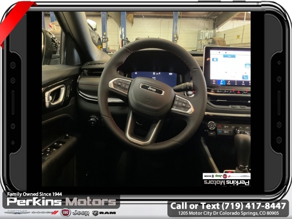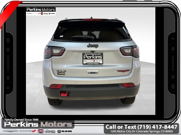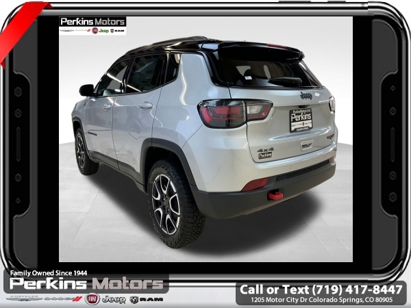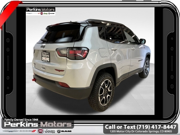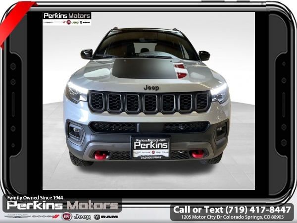 Factory MSRP: $41,835 $5,222 off MSRP! Silver Zynith Metallic Clearcoat 2025 Jeep Compass Trailhawk 4WD 8-Speed Automatic 2.0L I4 DOHC<br>4WD.<br>Check us out at www.perkinsmotors.com to see our specials! Since opening our doors in 1944, we’ve been proud to serve Colorado Springs, CO, and the surrounding areas of Pueblo, Castle Rock and Denver, CO. Throughout this time of being family owned for 80 years, we’ve maintained a firm commitment to our customers: to offer a wide selection of New Chrysler, Dodge, Fiat, Jeep, and Ram vehicles and quality pre-owned vehicles, and provide a quick, no-hassle car-buying process that ensures everyone drives off the lot satisfied with their purchase.<br><br>Quick Order Package 29E, Sun and Sound Group (Power Front/Fixed Rear Full Sunroof and Premium Alpine Speaker System), Trailhawk Elite Group (10.1 Touchscreen Display, 2nd Row USB Type A/C Charge Only, Alexa Built-In, Cluster 10.25 TFT Color Display, Connected Travel & Traffic Services, Driver Seat Memory, Foot Activated Open 'N Go Liftgate, GPS Navigation, HD Radio, Heated Front Seats, Heated Steering Wheel, Integrated Voice Command w/Bluetooth, LED Low/Highbeam Projector Headlamps, Power 2-Way Driver Lumbar Adjust, Power 2-Way Passenger Lumbar Adjust, Power 8-Way Adjust Front Passenger Seat, Power Adjust 8-Way Driver Seat, Power Liftgate, Premium Leather Trimmed Bucket Seats, Premium LED Fog Lamps, Premium Taillamps, Remote Start System, Reversible Carpet/Vinyl Cargo Mat, SiriusXM w/360L, Ventilated Front Seats, and Windshield Wiper De-Icer), 4WD, 4-Wheel Disc Brakes, 4.398 Final Drive Ratio, 6 Speakers, ABS brakes, Air Conditioning, Alloy wheels, AM/FM radio: SiriusXM, Auto High-beam Headlights, Auto-dimming Rear-View mirror, Automatic temperature control, Brake assist, Bumpers: body-color, Compass, Cruise Control, Delay-off headlights, Driver door bin, Driver vanity mirror, Dual front impact airbags, Dual front side impact airbags, Electronic Stability Control, Emergency communication system: Jeep Connect, Four wheel independent suspension, Front anti-roll bar, Front Bucket Seats, Front Center Armrest w/Storage, Front dual zone A/C, Front fog lights, Front License Plate Bracket, Front reading lights, Fully automatic headlights, Heated door mirrors, Illuminated entry, Knee airbag, Leather Shift Knob, Leather steering wheel, Low tire pressure warning, Occupant sensing airbag, Outside temperature display, Overhead airbag, Overhead console, Panic alarm, ParkView Rear Back-Up Camera, Passenger door bin, Passenger vanity mirror, Power door mirrors, Power steering, Power windows, Premium Cloth/Leather Trim Bucket Seats, Radio: Uconnect 5 w/10.1 Display, Rain sensing wipers, Rear anti-roll bar, Rear seat center armrest, Rear window defroster, Rear window wiper, Remote keyless entry, Security system, Split folding rear seat, Spoiler, Steering wheel mounted audio controls, Tachometer, Telescoping steering wheel, Tilt steering wheel, Traction control, Trip computer, Turn signal indicator mirrors, Variably intermittent wipers, and Wheels: 17 x 6.5 Painted Black Aluminum.<br><br>24/32 City/Highway MPG