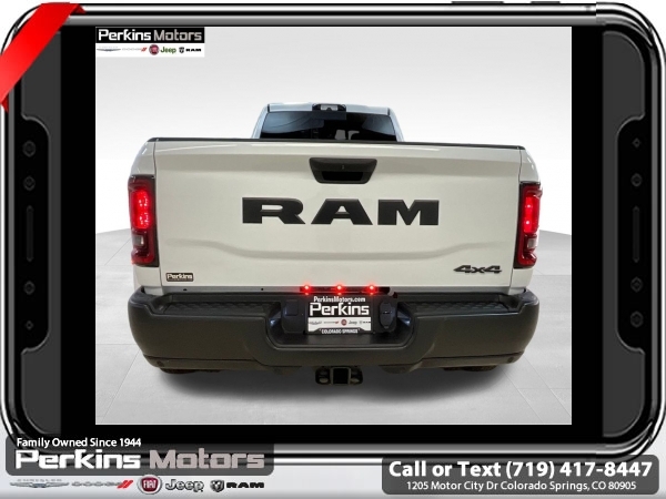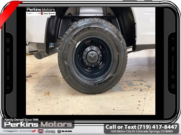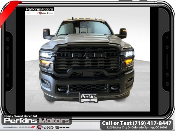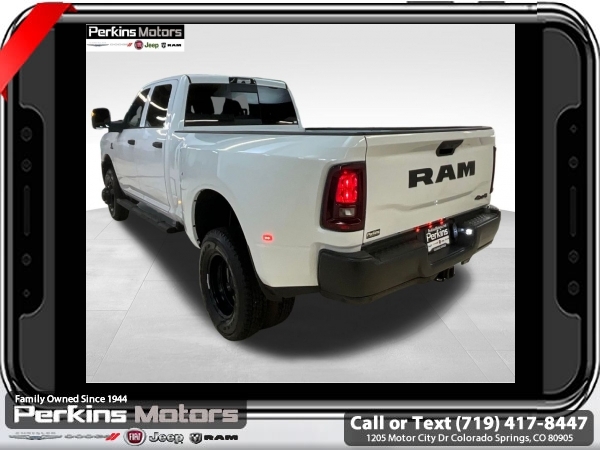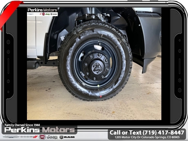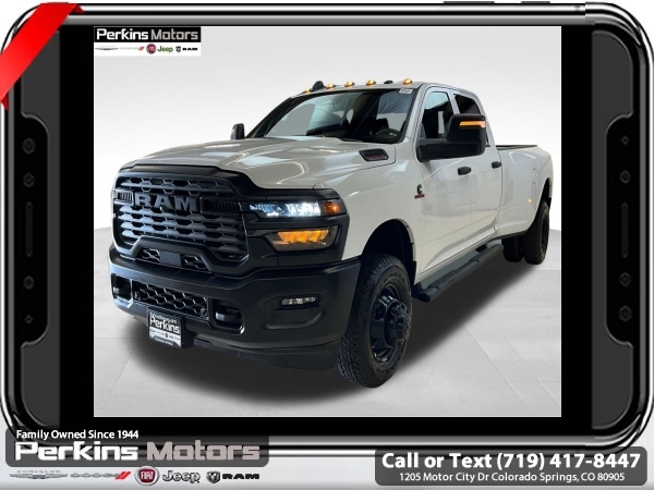 Factory MSRP: $74,505 $1,000 off MSRP! Bright White Clearcoat 2025 Ram 3500 Tradesman 4WD 8-Speed Automatic 6.7L I6<br><br>Check us out at www.perkinsmotors.com to see our specials! Since opening our doors in 1944, we’ve been proud to serve Colorado Springs, CO, and the surrounding areas of Pueblo, Castle Rock and Denver, CO. Throughout this time of being family owned for 80 years, we’ve maintained a firm commitment to our customers: to offer a wide selection of New Chrysler, Dodge, Fiat, Jeep, and Ram vehicles and quality pre-owned vehicles, and provide a quick, no-hassle car-buying process that ensures everyone drives off the lot satisfied with their purchase.<br><br>Cold Weather Group (Engine Block Heater and MOPAR Winter Front Grille Cover), Commercial Features Package (115V Auxiliary Front Power Outlet, 400W Inverter, Exterior 115V AC Outlet, and ParkSense Front/Rear Park Assist System), Max Tow Package (5th Wheel/Gooseneck Towing Prep Group), Quick Order Package 24A Tradesman, Tradesman Level 1 Equipment Group (12 Touchscreen Display, 2 Way Rear Headrest Seat, 4 Way Front Headrests, 40/20/40 Split Bench Seat, 4G LTE Wi-Fi Hot Spot, Air Conditioning ATC w/Dual Zone Control, Alexa Built-In, Apple CarPlay, Auto-Dimming Rear-View Mirror, Black Exterior Mirrors, Carpet Floor Covering, Cloth 40/20/40 Bench Seat, Connected Travel & Traffic Services, Connectivity - US/Canada, Convenience Group, Disassociated Touchscreen Display, Emergency Vehicle Alert System (EVAS), Exterior Mirrors Courtesy Lamps, Exterior Mirrors w/Heating Element, Exterior Mirrors w/Supplemental Signals, For Details Visit DriveUconnect.com, For More Info, Call 800-643-2112, Front & Rear Floor Mats, Front Armrest w/Cupholders, Global Telematics Box Module (TBM), Google Android Auto, GPS Antenna Input, GPS Navigation, HD Radio, Integrated Voice Command w/Bluetooth, Manual Adjust 4-Way Driver Seat, Manual Adjust 4-Way Front Passenger Seat, Manual Folding Exterior Mirrors, Manual Telescoping Mirrors, Mirror Running Lights, Mopar Black Tubular Side Steps, Off-Road Information Pages, Power Adjust Mirrors, Power Heat Fold Telescopic Mirrors, Power-Adjustable Convex Aux Mirrors, Radio: Uconnect 5 Nav w/12.0 Display, Rear Folding Seat, Rear Power Sliding Window, Remote USB Port - Charge Only, Selectable Tire Fill Alert, SiriusXM Radio Service, SiriusXM w/360L, Storage Tray, Tinted Acoustic Windshield Glass, and Trailer Tow Pages), 3.42 Axle Ratio, 3.73 Axle Ratio, 4-Wheel Disc Brakes, 50 Gallon Fuel Tank, 6 Speakers, 6000# Front Axle w/Hub Ext, ABS brakes, Air Conditioning, AM/FM radio: SiriusXM, Apple CarPlay/Android Auto, Black Wheel Center Hub, Box & Rear Fender Clearance Lamps, Brake assist, Clearance Lamps, Compass, Cruise Control, Delay-off headlights, Driver door bin, Dual front impact airbags, Dual front side impact airbags, Dual Rear Wheels, Electronic Stability Control, Front anti-roll bar, Front Center Armrest w/Storage, Front fog lights, Front License Plate Bracket, Front reading lights, Fully automatic headlights, HD Vinyl 40/20/40 Split Bench Seat, Illuminated entry, Low tire pressure warning, Manufacturer's Statement of Origin, Occupant sensing airbag, Outside temperature display, Overhead airbag, Overhead console, Panic alarm, ParkView Rear Back-Up Camera, Passenger door bin, Passenger vanity mirror, Power steering, Power windows, Radio data system, Radio: Uconnect 5 w/8.4 Display, Rear step bumper, Rear Wheelhouse Liners, Rear window defroster, Remote keyless entry, Tachometer, Tilt steering wheel, Traction control, Upfitter Electronic Module (VSIM), Variably intermittent wipers, Voltmeter, Wheels: 17 x 6.0 Black Painted Steel, and Wheels: 18 x 8.0 Black Painted SteeL. Sale price includes all manufacture's incentives and dealer discounts. Sale price not available on lease or compatible with special APR. $1000 - 2025 National Bonus Cash . Exp. 04/30/2025