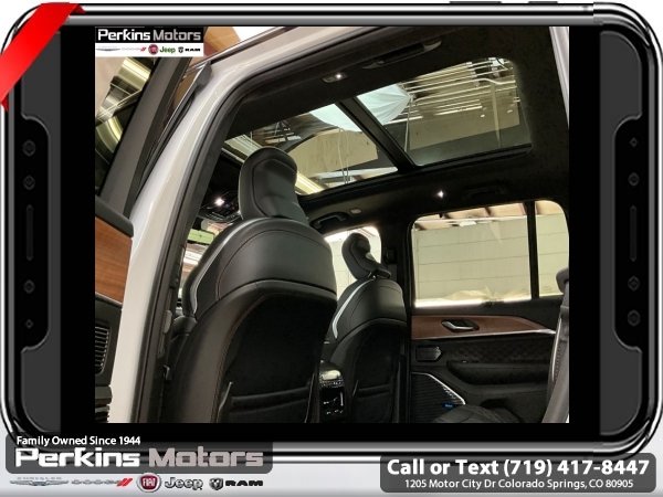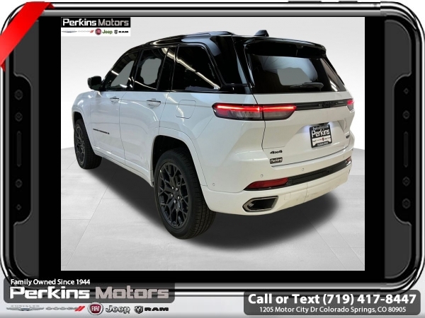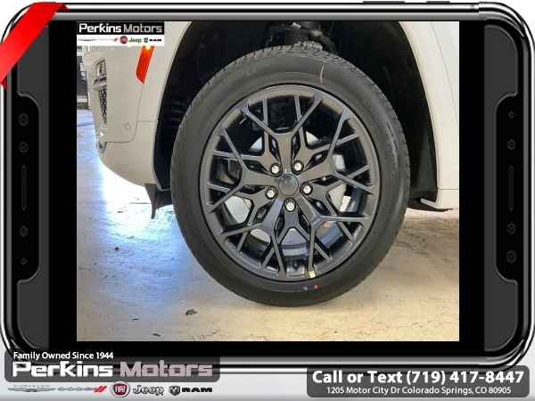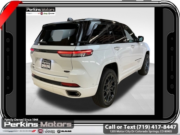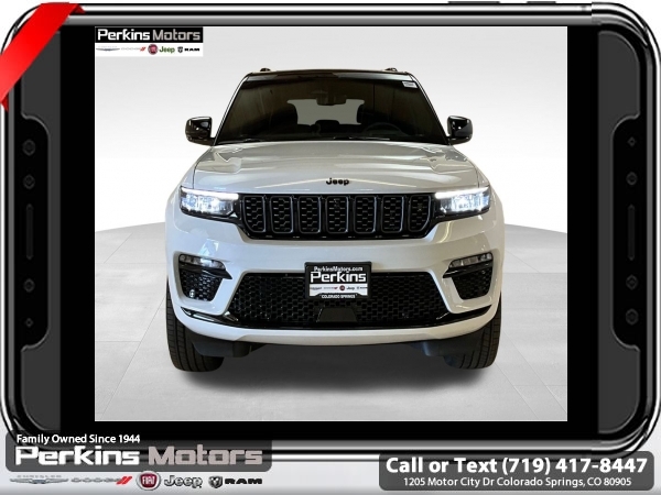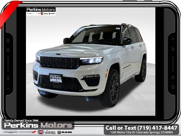 Factory MSRP: $73,625 $9,660 off MSRP! Bright White Clearcoat 2025 Jeep Grand Cherokee Summit 4WD 8-Speed Automatic 3.6L V6 24V VVT<br>4WD.<br>Check us out at www.perkinsmotors.com to see our specials! Since opening our doors in 1944, we’ve been proud to serve Colorado Springs, CO, and the surrounding areas of Pueblo, Castle Rock and Denver, CO. Throughout this time of being family owned for 80 years, we’ve maintained a firm commitment to our customers: to offer a wide selection of New Chrysler, Dodge, Fiat, Jeep, and Ram vehicles and quality pre-owned vehicles, and provide a quick, no-hassle car-buying process that ensures everyone drives off the lot satisfied with their purchase.<br><br>ADV Protech Group IV (Heads-Up Display, Night Vision w/Pedestrian-Animal Detection, Rearview Autodim Digital Display Mirror, and Windshield Wiper De-Icer), Hands-Free Active Driving Assist System (Auxiliary Battery), High Altitude Package (Gloss Black Exterior Accents, Neutral Gray Exterior Accents, Painted Door Cladding, and Wheels: 21 x 9 Black Painted Aluminum), Luxury Tech Group V (2nd-Row Manual Window Shades and Wireless Charging Pad), Quick Order Package 23U Summit Reserve (19 Speakers High Performance Audio, 950 Watt Amplifier, Active Noise Control System, Deluxe Headliner, Front Passenger Interactive Display, Palermo Leather Door Trim, Palermo Leather Seats, Summit Reserve, Summit Reserve Badge, Ventilated Rear Seats, and Wheels: 21 x 9 Machined Face/Painted Aluminum), 4WD, 10 Speakers, 4-Wheel Disc Brakes, ABS brakes, Adaptive suspension, Air Conditioning, Alloy wheels, AM/FM radio: SiriusXM with 360L, Anti-whiplash front head restraints, Audio memory, Auto High-beam Headlights, Auto-dimming door mirrors, Auto-dimming Rear-View mirror, Auto-leveling suspension, Automatic temperature control, Brake assist, Bumpers: body-color, Compass, Cruise Control, Delay-off headlights, Driver door bin, Driver vanity mirror, Dual front impact airbags, Dual front side impact airbags, Electronic Stability Control, Emergency communication system, Four wheel independent suspension, Front anti-roll bar, Front Bucket Seats, Front Center Armrest w/Storage, Front dual zone A/C, Front fog lights, Front License Plate Bracket, Front reading lights, Fully automatic headlights, Garage door transmitter, Genuine wood dashboard insert, Genuine wood door panel insert, Heated door mirrors, Heated front seats, Heated rear seats, Heated steering wheel, Illuminated entry, Knee airbag, Leather steering wheel, Low tire pressure warning, Memory seat, Model Year Tracking, Nappa Leather Seats, Navigation System, Normal Duty Suspension, Occupant sensing airbag, Outside temperature display, Overhead airbag, Overhead console, Panic alarm, Passenger door bin, Passenger vanity mirror, Power door mirrors, Power driver seat, Power Liftgate, Power moonroof, Power passenger seat, Power steering, Power windows, Radio data system, Radio: Uconnect 5 Nav w/10.1 Display, Rain sensing wipers, Rear air conditioning, Rear anti-roll bar, Rear dual zone A/C, Rear reading lights, Rear seat center armrest, Rear window defroster, Rear window wiper, Remote keyless entry, Security system, Speed-Sensitive Wipers, Split folding rear seat, Spoiler, Steering wheel memory, Steering wheel mounted audio controls, Tachometer, Telescoping steering wheel, Tilt steering wheel, Traction control, Trip computer, Turn signal indicator mirrors, Variably intermittent wipers, Ventilated front seats, Voltmeter, and Wheels: 20 x 8.5 Fully Painted Aluminum Silver.<br><br>19/26 City/Highway MPG