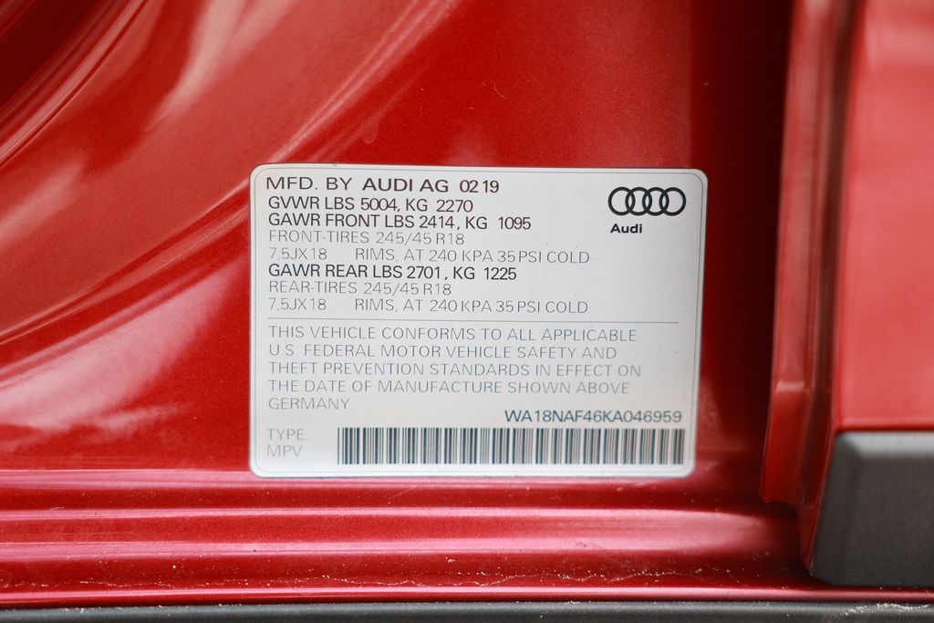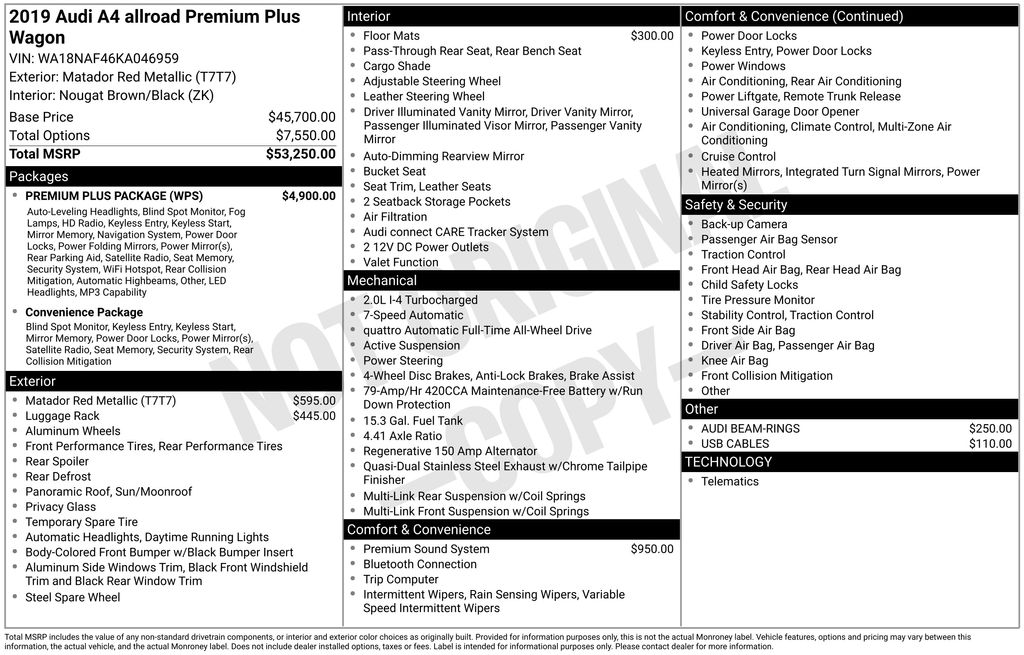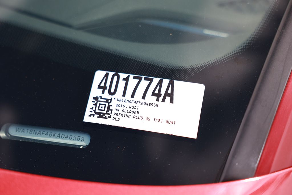 Matador Red Metallic 2019 Audi A4 allroad 2.0T Premium Plus quattro quattro 7-Speed Automatic S tronic 2.0L 4-Cylinder TFSI DOHC ABS brakes, Alarm System w/Motion Sensors, Alloy wheels, Audi Advanced Key, Audi Connect PRIME & PLUS, Audi MMI Navigation Plus w/MMI Touch, Audi Phone Box, Audi Side Assist w/Pre Sense Rear, Audi Virtual Cockpit, Auto-Dimming Exterior Mirror, Bang & Olufsen Sound System w/3D Sound, Compass, Convenience Package, Electronic Stability Control, Exterior Parking Camera Rear, Front dual zone A/C, Heated door mirrors, Heated Front Seats, Heated front seats, Illuminated entry, Leatherette Covered Center Console & Door Armrests, LED Headlights, Low tire pressure warning, Memory for Driver's Seat, Parking System Plus (Front/Rear Acoustic Sensors), Power Folding Exterior Mirrors, Power Liftgate, Power moonroof, Premium Plus Package, Remote keyless entry, SIRIUS Satellite Radio, Traction control.22/29 City/Highway MPG