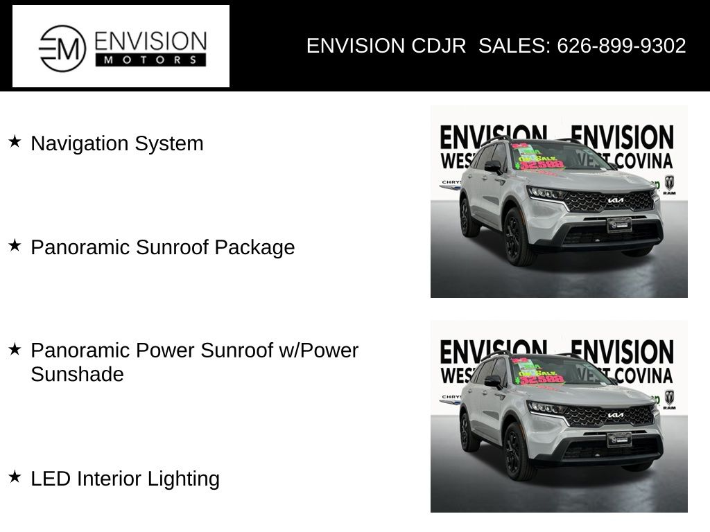 WE SPECIALIZE IN ALL CREDIT PROFILES! See what we can do for you! Call to find out (626) 899-9302.CARFAX One-Owner.AWD, LED Interior Lighting, Navigation System, Panoramic Power Sunroof w/Power Sunshade, Panoramic Sunroof Package.Wolf Gray2023 Kia Sorento X-Line S AWD 8-Speed Automatic 2.5L I4 DGI DOHC 16V LEV3-ULEV70 191hp**********All Pricing and Advertised Prices for any/all vehicles offered for sale does not include dealer installed accessories which can be purchased for an additional cost.********** The Factory Rebates may not be available on this vehicle if you elect to take advantage of a Special Alternative APR or Special Lease program. Some Factory Rebates are California Resident specific and may vary for residents of other states. NO sales to Dealers, Brokers or Exporters. For out of state purchase, customers must be present to purchase. If shipping is required, dealership must facilitate; no exceptions. Please contact us for special Multi-Vehicle or Fleet pricing. Prices are plus government fees and taxes, any finance charges, $85 documentary fee, $29 electronic registration fee, any emission testing charge and $1.75 per new tire state tire fee. *** We make every effort to provide accurate information, but please verify before purchasing. Leasing & financing available on approved credit. Trade-ins accepted. Subject to prior sale.