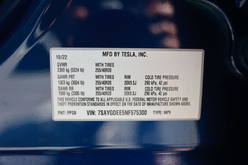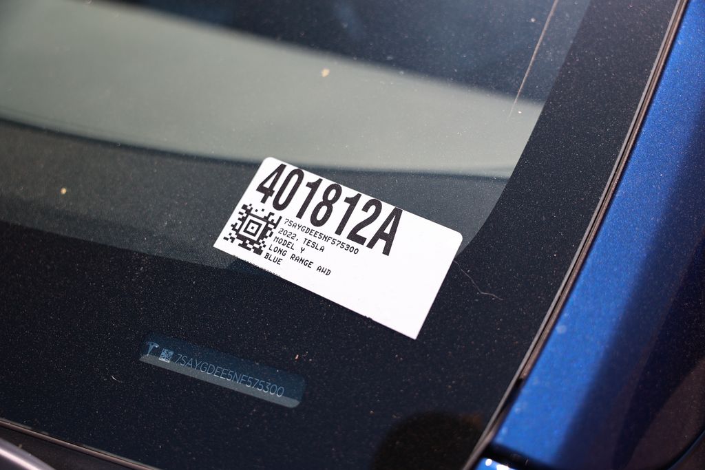 Blue 2022 Tesla Model Y Long Range AWD 1-Speed Automatic Electric Motor 5 Seat Interior, Exterior Parking Camera Rear, Heated front seats, Heated rear seats, Lane Departure Warning System, Navigation System, Power Liftgate, Premium Audio System, Remote keyless entry, Wheels: 19" x 9.5" Gemini.127/117 City/Highway MPG