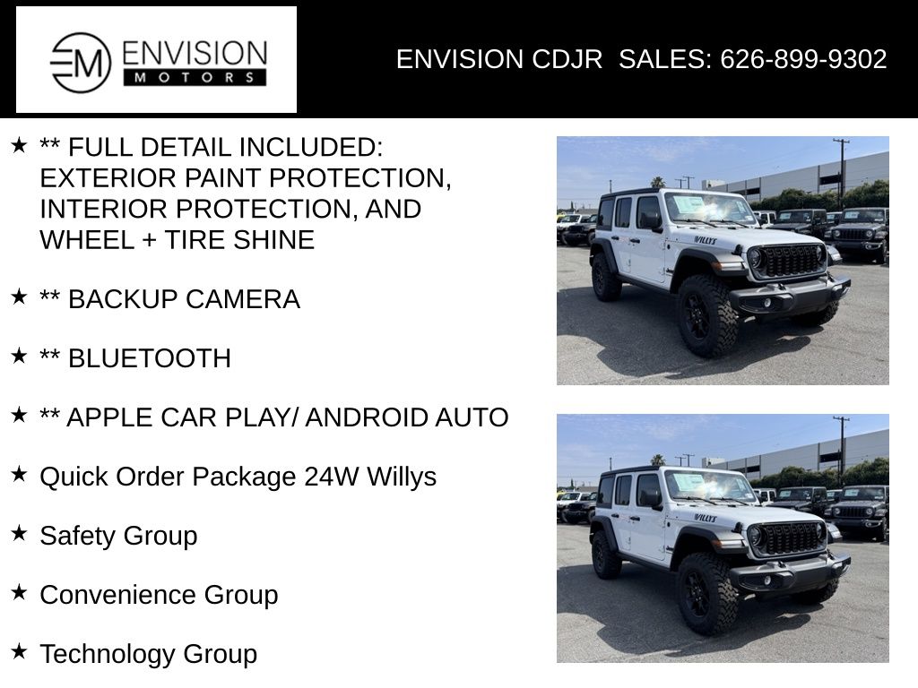 ** FULL DETAIL INCLUDED: EXTERIOR PAINT PROTECTION, INTERIOR PROTECTION, AND WHEEL + TIRE SHINE, ** BACKUP CAMERA, ** BLUETOOTH, ** APPLE CAR PLAY/ ANDROID AUTO, 2-Door Passive Entry, Front Door Locks, 240 Amp Alternator, 4-Wheel Drive Swing Gate Decal, 4.10 Rear Axle Ratio, 7 & 4 Pin Wiring Harness, 97 MPH Vehicle Max Speed Calibration, Advanced Brake Assist, Air Conditioning w/Auto Temperature Control, Air Filtering, Alpine Premium Audio System, Auto High Beam Headlamp Control, Automatic Headlamps, Auxiliary Switches, Black Grille, Blind Spot & Cross Path Detection, Class II Receiver Hitch, Cluster 7.0" TFT Color Display, Convenience Group, Conventional Differential Front Axle, Corning Gorilla Glass, Dana M210 Wide HD Tube Front Axle, Dana M220 Wide Rear Axle, Daytime Running Lamps LED Accents, Deep Tint Sunscreen Windows, E-Locker Rear Axle, Emergency/Assistance Call, Enhanced Adaptive Cruise Control, Front 1-Touch Down Power Windows, Front LED Fog Lamps, Full Speed Forward Collision Warning Plus, Heated Front Seats, Heated Steering Wheel, Injection Molded Black Rear Bumper, LED Premium Reflector Headlamps, LED Taillamps, Mold In Color Bumper w/Gloss Black, Molded in Color Rubicon Highline Flare, MOPAR All-Weather Floor Mats, Off-Road Plus Mode, ParkSense Rear Park Assist System, Power Heated Mirrors, Premium Wrapped Steering Wheel, Quick Order Package 24W Willys, Remote Keyless Entry, Remote Start System, Safety Group, Security Alarm, Speed Sensitive Power Locks, Sun Visors w/Illuminated Vanity Mirrors, Technology Group, Universal Garage Door Opener, Wheels: 17" x 7.5" Painted Black, Willy's Suspension, Willys, Willys Hood Decal.Bright White Clearcoat2024 Jeep Wrangler Willys 4WD 8-Speed Automatic 2.0L I4 DOHC Price includes: $500 - 2024 National 2024 First Responder Bonus Cash. Exp. 06/30/2025 10% Msrp - 2024 National Standalone 10% Below MSRP (1/B/L/E). Exp. 04/30/2025