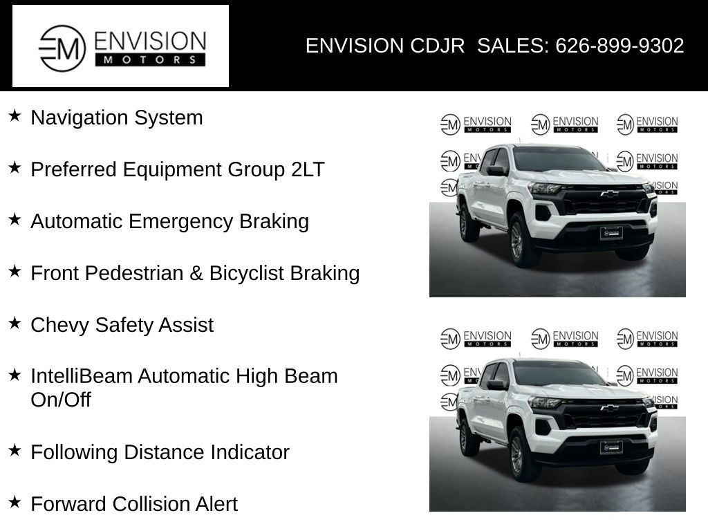 WE SPECIALIZE IN ALL CREDIT PROFILES! See what we can do for you! Call to find out (626) 899-9302.CARFAX One-Owner. Clean CARFAX.Automatic Emergency Braking, Chevy Safety Assist, Following Distance Indicator, Forward Collision Alert, Front Pedestrian & Bicyclist Braking, IntelliBeam Automatic High Beam On/Off, Lane Keep Assist w/Lane Departure Warning, Navigation System, Preferred Equipment Group 2LT, Wheels: 17" x 8" Argent Metallic Aluminum.Summit White2023 Chevrolet Colorado LT RWD 8-Speed Automatic 2.7L Turbo**********All Pricing and Advertised Prices for any/all vehicles offered for sale does not include dealer installed accessories which can be purchased for an additional cost.********** The Factory Rebates may not be available on this vehicle if you elect to take advantage of a Special Alternative APR or Special Lease program. Some Factory Rebates are California Resident specific and may vary for residents of other states. NO sales to Dealers, Brokers or Exporters. For out of state purchase, customers must be present to purchase. If shipping is required, dealership must facilitate; no exceptions. Please contact us for special Multi-Vehicle or Fleet pricing. Prices are plus government fees and taxes, any finance charges, $85 documentary fee, $29 electronic registration fee, any emission testing charge and $1.75 per new tire state tire fee. *** We make every effort to provide accurate information, but please verify before purchasing. Leasing & financing available on approved credit. Trade-ins accepted. Subject to prior sale.
