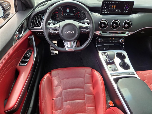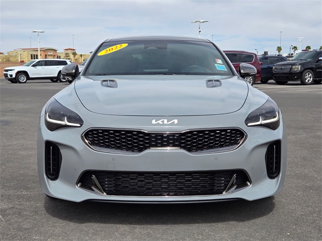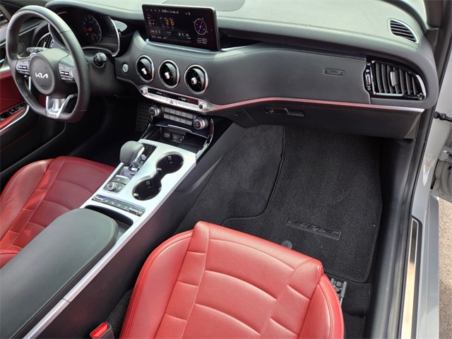 CARFAX One-Owner.Odometer is 12926 miles below market average!Ceramic Silver 2022 Kia Stinger GT2 AWD 8-Speed Automatic 3.3L V6 DGIIf you don't drive here, you can't save here!Price may not include recon fee. Red Interior Color Package, 15 Speakers, 4-Wheel Disc Brakes, ABS brakes, Adaptive suspension, Air Conditioning, Alloy wheels, AM/FM radio: SiriusXM, Anti-whiplash front head restraints, Apple CarPlay & Android Auto, Auto High-beam Headlights, Auto tilt-away steering wheel, Auto-dimming door mirrors, Auto-dimming Rear-View mirror, Automatic temperature control, Brake assist, Bumpers: body-color, Cargo Mat, Compass, Delay-off headlights, Door Sill Applique, Driver door bin, Driver vanity mirror, Dual front impact airbags, Dual front side impact airbags, Electronic Stability Control, Emergency communication system: UVO eServices, Four wheel independent suspension, Front anti-roll bar, Front Bucket Seats, Front Center Armrest, Front dual zone A/C, Front reading lights, Fully automatic headlights, Garage door transmitter: HomeLink, harman/kardon® Speakers, Heads-Up Display, Heated & Ventilated Front Bucket Seats, Heated door mirrors, Heated front seats, Heated rear seats, Illuminated entry, Knee airbag, Low tire pressure warning, Memory seat, Nappa Leather Seat Trim, Navigation System, Occupant sensing airbag, Outside temperature display, Overhead airbag, Overhead console, Panic alarm, Passenger door bin, Passenger vanity mirror, Power door mirrors, Power driver seat, Power Liftgate, Power moonroof, Power passenger seat, Power steering, Power windows, Radio: harmon/kardon AM/FM/HD Audio System, Rain sensing wipers, Rear air conditioning, Rear anti-roll bar, Rear Bumper Applique, Rear reading lights, Rear seat center armrest, Rear window defroster, Remote keyless entry, Security system, Smart Key w/ Push Button and Remote Start, Speed control, Speed-sensing steering, Speed-Sensitive Wipers, Split folding rear seat, Sport steering wheel, Steering wheel memory, Steering wheel mounted audio controls, Tachometer, Telescoping steering wheel, Tilt steering wheel, Traction control, Trip computer, Turn signal indicator mirrors, Variably intermittent wipers, Ventilated front seats, Wheel Locks, and Wheels: 8.0J x 19 Front/8.5J x 19 Rear Alloy.