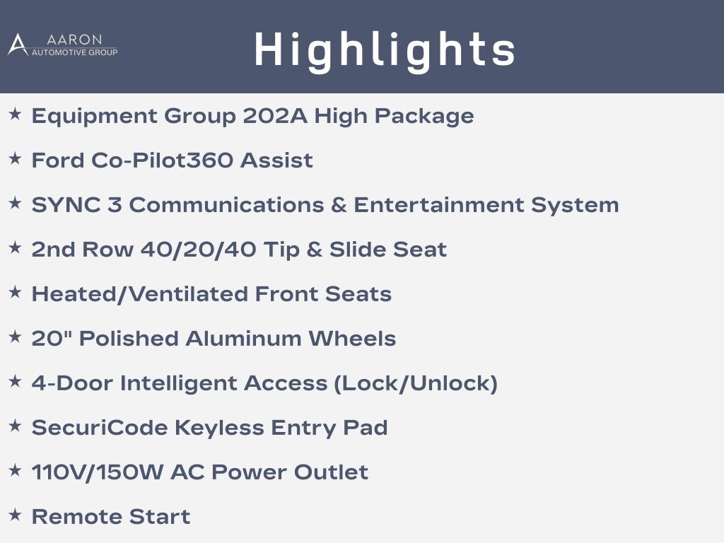 110V/150W AC Power Outlet, 2 Smart Charging USB-A Ports In 3rd Row, 20" Polished Aluminum Wheels, 2nd Row 40/20/40 Tip & Slide Seat, 3rd Row Power-Folding Head Restraints, 3rd Row Vinyl Seat, 4-Door Intelligent Access (Lock/Unlock), ActiveX-Trimmed 1st & 2nd Row Seats, Adaptive Cruise Control, Advanced Security Pack, Chrome Platform Running Boards, Equipment Group 202A High Package, Exterior Parking Camera Rear, Ford Co-Pilot360 Assist, Heated Steering Wheel, Heated/Ventilated Front Seats, Instrument Panel Cluster, Power Liftgate, Power Tilt/Telescopic Steering Wheel w/Memory, Power-Folding Sideview Mirrors w/Autofold, Remote keyless entry, Remote Start, Santa Cruz Vinyl-Wrapped Center Console Side Rails, SecuriCode Keyless Entry Pad, SYNC 3 Communications & Entertainment System, Voice-Activated Touch-Screen Navigation System, Wireless Charging Pad.CARFAX One-Owner.Clean CARFAX.To see more quality vehicles like this one right just click on AaronFordofPoway.com or dial (858) 748-1400.