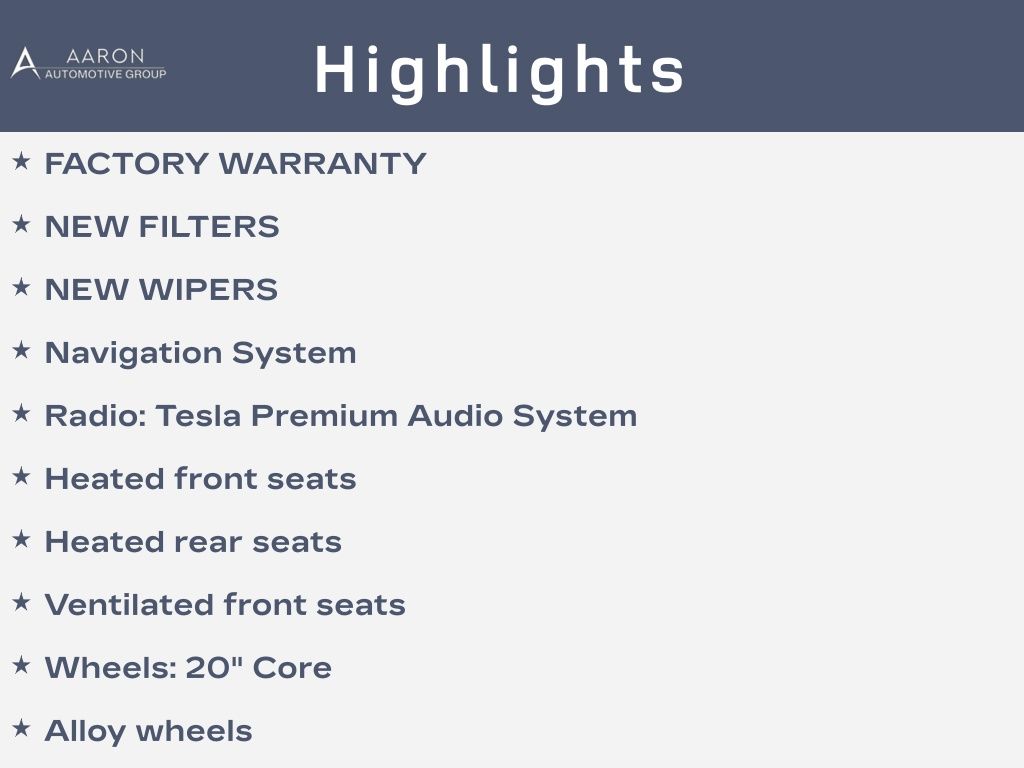 FACTORY WARRANTY, NEW FILTERS, NEW WIPERS, 4D Crew Cab, Electric Motor, 1-Speed Automatic, AWD, Alloy wheels, Exterior Parking Camera Rear, Front dual zone A/C, Heated & Cooled Ventilated Front Bucket Seats, Heated front seats, Heated rear seats, HVAC memory, Knee airbag, Lane Departure Warning System, Memory seat, Navigation System, Overhead airbag, Radio: Tesla Premium Audio System, Ventilated front seats, Wheels: 20" Core.Clean CARFAX.CARFAX One-Owner.