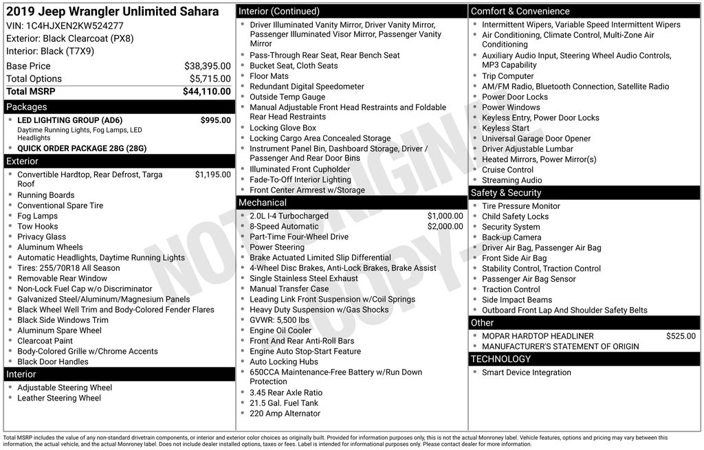 Priced below KBB Fair Purchase Price!LIFE TIME WARRANTY, FRESH OIL CHANGE, NEW FILTERS, NEW WIPERS, Wrangler Unlimited Sahara, 4D Sport Utility, 2.0L I4 DOHC, 8-Speed Automatic, 4WD, Alloy wheels, Apple CarPlay/Android Auto, Black 3-Piece Hard Top, Daytime Running Lamps LED Accents, Freedom Panel Storage Bag, Front dual zone A/C, Front fog lights, Front LED Fog Lamps, LED Lighting Group, LED Reflector Headlamps, LED Taillamps, No Soft Top, Quick Order Package 28G, Radio: Uconnect 4 w/7" Display, Rear Window Defroster, Rear Window Wiper/Washer.Clean CARFAX.