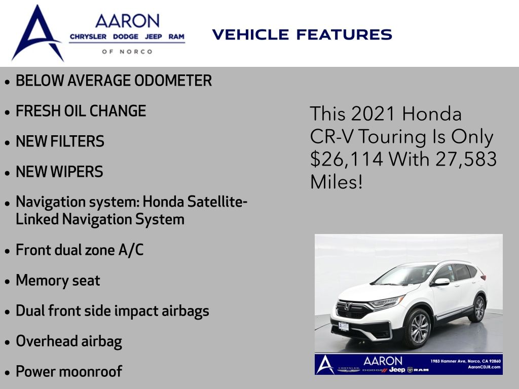 Priced below KBB Fair Purchase Price!BELOW AVERAGE ODOMETER, FRESH OIL CHANGE, NEW FILTERS, NEW WIPERS, CR-V Touring, 4D Sport Utility, 1.5L I4 DOHC 16V, AWD, Adaptive Cruise Control: Adaptive CrControluise (ACC) with Low-Speed Follow, Alloy wheels, Blind Spot Information (BSI) System warning, Dual front side impact airbags, Electronic Stability Control, Exterior Parking Camera Rear, Forward collision: Collision Mitigation Braking System (CMBS) + FCW mitigation, Front dual zone A/C, Front fog lights, Heated Front Bucket Seats, Memory seat, Navigation system: Honda Satellite-Linked Navigation System, Overhead airbag, Power Liftgate, Power moonroof, Roof rack: rails only, Spoiler.Clean CARFAX.CARFAX One-Owner.