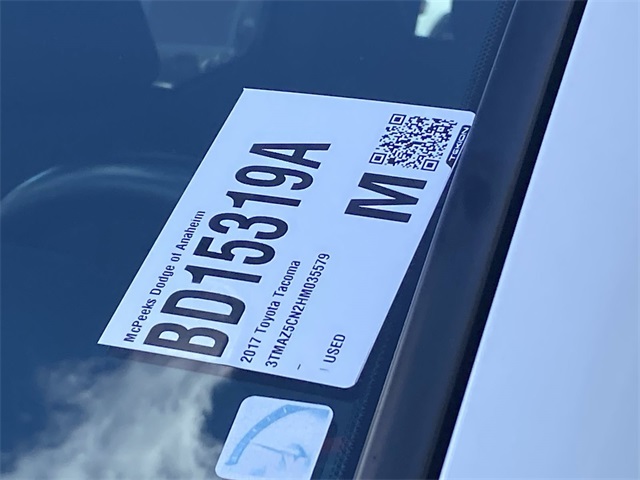 Odometer is 32028 miles below market average! INTERIOR & EXTERIOR PROFESSIONALLY DETAILED FOR DELIVERY, MCPEEK CHRYSLER DODGE JEEP RAM FAMILY OWNED AND OPERATED SINCE 1961 !!!!!.Super White 2017 Toyota Tacoma SR5 V6 RWD 6-Speed AutomaticAwards: * 2017 KBB.com Best Resale Value Awards * 2017 KBB.com 10 Most Awarded BrandsReceive Free lube and oil filter changes for up to 45,000 miles for 3 years!!! McPeek's Dodge of Anahiem 1221 S. Auto Center Drive Anahiem, CA 92806 714-262-4902.