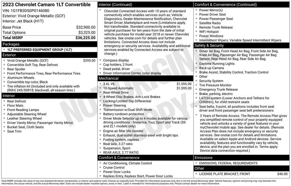 FRESH OIL CHANGE, NEW FILTERS, NEW WIPERS, Camaro 1LT, 2D Convertible, 3.6L V6 DI, Manual, RWD, Alloy wheels, Apple CarPlay/Android Auto, Dual front side impact airbags, Exterior Parking Camera Rear, Knee airbag, Spoiler.CARFAX One-Owner.