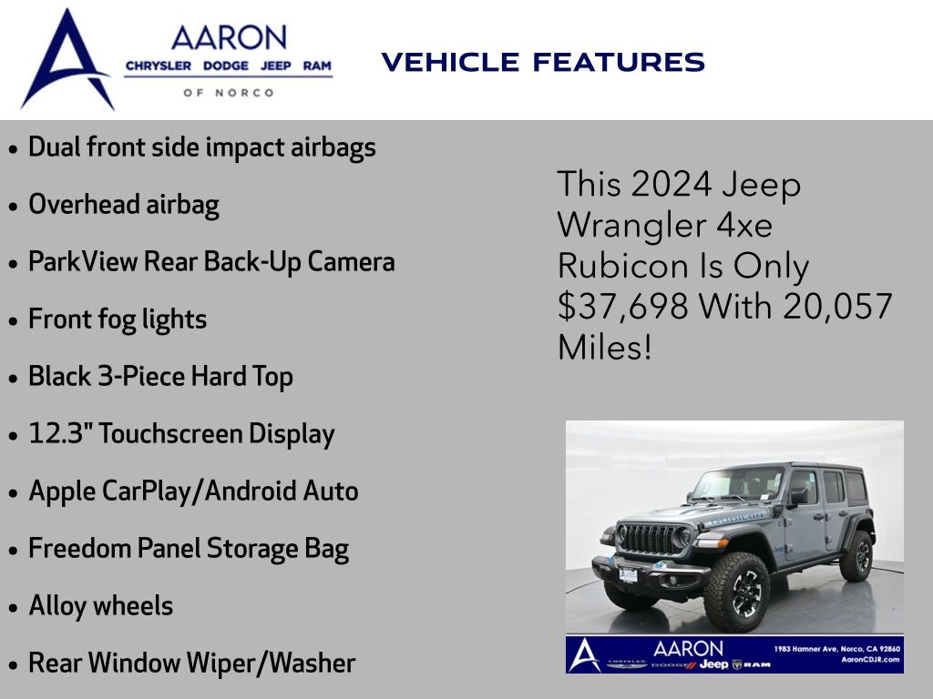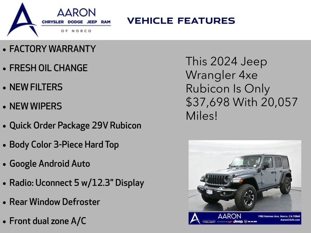 Priced below KBB Fair Purchase Price!FACTORY WARRANTY, FRESH OIL CHANGE, NEW FILTERS, NEW WIPERS, Wrangler Rubicon 4xe, 4D Sport Utility, 2.0L I4 DOHC, 8-Speed Automatic, 4WD, 12.3" Touchscreen Display, Alloy wheels, Apple CarPlay/Android Auto, Black 3-Piece Hard Top, Body Color 3-Piece Hard Top, Dual front side impact airbags, Freedom Panel Storage Bag, Front dual zone A/C, Front fog lights, Google Android Auto, Overhead airbag, ParkView Rear Back-Up Camera, Quick Order Package 29V Rubicon, Radio: Uconnect 5 w/12.3" Display, Rear Window Defroster, Rear Window Wiper/Washer.Clean CARFAX.CARFAX One-Owner.