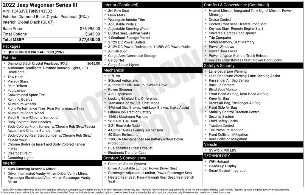 Priced below KBB Fair Purchase Price!LIFE TIME WARRANTY, FRESH OIL CHANGE, NEW FILTERS, NEW WIPERS, Wagoneer Series III, 4D Sport Utility, 5.7L V8, 8-Speed Automatic, 4WD, 3rd row seats: bench, Alloy wheels, Dual front side impact airbags, Exterior Parking Camera Rear, Front dual zone A/C, Front fog lights, Heads-Up Display, Heated front seats, Knee airbag, Memory seat, Navigation System, Overhead airbag, Power Liftgate, Quick Order Package 22N, Radio: Uconnect 5 Nav w/10.1" Display, Rear dual zone A/C, Ventilated front seats, Wheels: 20" x 9.0" Premium 2 Aluminum.Clean CARFAX.CARFAX One-Owner.