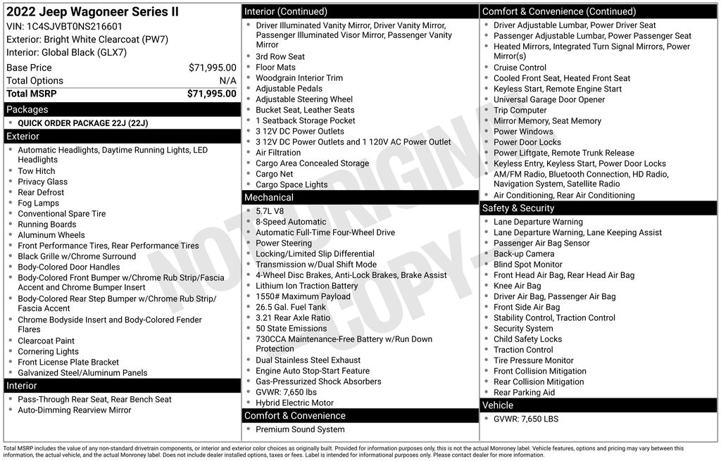 Priced below KBB Fair Purchase Price!LIFE TIME WARRANTY, FRESH OIL CHANGE, NEW FILTERS, NEW WIPERS, Wagoneer Series II, 4D Sport Utility, 5.7L V8, 8-Speed Automatic, 4WD, 3rd row seats: bench, Alloy wheels, Exterior Parking Camera Rear, Front dual zone A/C, Front fog lights, Knee airbag, Leather Trimmed Bucket Seats, Memory seat, Navigation System, Overhead airbag, Power Liftgate, Quick Order Package 22J, Radio: Uconnect 5 Nav w/10.1" Display, Rear dual zone A/C, Ventilated front seats, Wheels: 20" x 9.0" Aluminum Base Finish.Clean CARFAX.CARFAX One-Owner.