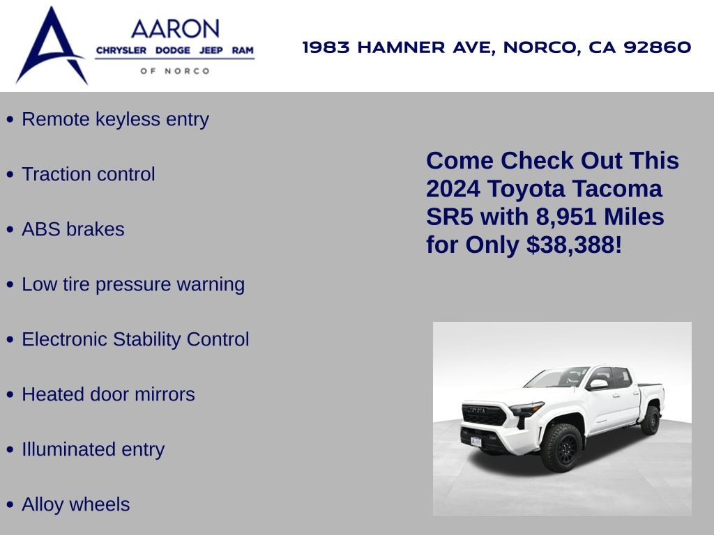 Priced below KBB Fair Purchase Price!Tacoma SR5, 4D Double Cab, 2.4L 4-Cylinder, 8-Speed Automatic, 4WD, ABS brakes, Alloy wheels, Electronic Stability Control, Heated door mirrors, Illuminated entry, Low tire pressure warning, Remote keyless entry, Traction control.CARFAX One-Owner.