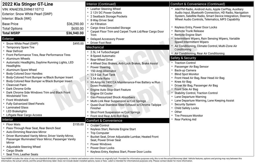 Snow White Pearl 2022 Kia Stinger GT-Line RWD 8-Speed Automatic I422/32 City/Highway MPG