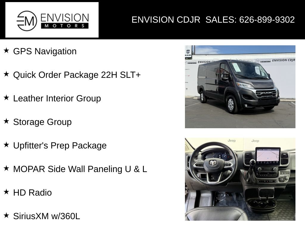 WE SPECIALIZE IN ALL CREDIT PROFILES! See what we can do for you! Call to find out (626) 899-9302.Recent Arrival! CARFAX One-Owner. Clean CARFAX.100 Amp Battery, 115V Auxiliary Power Outlet, 12V Rear Auxiliary Power Outlet, 220 Amp Alternator, 6-Way Manual Adjust Driver Seat, 6-Way Manual Adjust Front Passenger Seat, Adaptive Cruise Control w/Stop & Go, Ambient LED Interior Lighting, Auto High Beam Headlamp Control, Automatic Headlamps, Auxiliary Switches, Black/Gray Seats, Blind Spot & Cross Path Detection, Cargo Net, Chrome Front Grille, Cluster 7.0" TFT Color Display, Connected Travel & Traffic Services, Cowl Aesthetic Cover, Digital Rearview Mirror w/Autodim, Driver Seat Armrest, Driver Swivel Seat, Front LED Fog Lamps, GPS Navigation, HD Radio, Integrated Voice Command w/Bluetooth, Leather Interior Group, Leather Trimmed Bucket Seats, Leather Wrapped Steering Wheel, LED Daytime Running Headlamps, LED Reflector Headlamps, Manual 2-Way Driver Lumbar Adjust, Manual 2-Way Passenger Lumbar Adjust, MOPAR Side Wall Paneling U & L, ParkSense Front/Rear Park Assist System, Passenger Bucket Seat, Passenger Seat Armrest, Passenger Swivel Seat, Passive Entry, Power Adjust Mirrors, Power Folding/Heated Mirrors, Power-Adjustable Convex Aux Mirrors, Quick Order Package 22H SLT+, Radio: Uconnect 5 Nav w/10.1" Display, Remote Start System, Shelf Above Roof Trim, Side Wall Paneling Lower, SiriusXM w/360L, Storage Group, Traffic Sign Information, Underseat Storage Tray, Upfitter Electronic Module (VSIM), Upfitter's Prep Package, Wheels: 16" x 6.0" Aluminum Painted Silver, Wireless Charging Pad.Granite Crystal Metallic Clearcoat2024 Ram ProMaster 1500 Low Roof FWD 9-Speed 948TE Automatic 3.6L V6 24V VVT**********All Pricing and Advertised Prices for any/all vehicles offered for sale does not include dealer installed accessories which can be purchased for an additional cost.********** The Factory Rebates may not be available on this vehicle if you elect to take advantage of a Special Alternative APR or Special Lease program. Some Factory Rebates are California Resident specific and may vary for residents of other states. NO sales to Dealers, Brokers or Exporters. For out of state purchase, customers must be present to purchase. If shipping is required, dealership must facilitate; no exceptions. Please contact us for special Multi-Vehicle or Fleet pricing. Prices are plus government fees and taxes, any finance charges, $85 documentary fee, $29 electronic registration fee, any emission testing charge and $1.75 per new tire state tire fee. *** We make every effort to provide accurate information, but please verify before purchasing. Leasing & financing available on approved credit. Trade-ins accepted. Subject to prior sale.