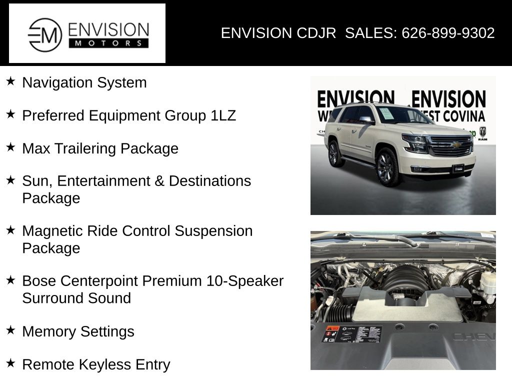 WE SPECIALIZE IN ALL CREDIT PROFILES! See what we can do for you! Call to find out (626) 899-9302.Clean CARFAX.4WD, Jet Black Leather, 2-Speed Active Electronic AutoTrac Transfer Case, 3.42 Rear Axle Ratio, 3rd Row 60/40 Power Fold Split-Bench, 5 12-Volt Auxiliary Power Outlets, Auto-Dimming Inside Rear-View Mirror, Bose Centerpoint Premium 10-Speaker Surround Sound, Driver Inboard & Front Passenger Airbags, Floor Console, Fog Lamps, Forward Collision Alert, Front & Rear Parking Assist, Hands Free Power Liftgate, Heated 2nd Row Seats, Heated Leather Wrapped Steering Wheel, Heavy-Duty Rear Locking Differential, Integrated Trailer Brake Controller, Keyless Start Switch, Lane Departure Warning & Safety Alert Seat, Magnetic Ride Control Suspension Package, Max Trailering Package, Memory Settings, Navigation System, Passive Entry System, Power Adjustable Pedals, Power Release 2nd Row Bucket Seats, Power Sunroof, Power Tilt & Telescoping Steering Column, Power-Folding Heated Outside Mirrors, Preferred Equipment Group 1LZ, Rear Cross-Traffic Alert, Rear Seat Blu-Ray/DVD Entertainment System, Remote Keyless Entry, Side Blind Zone Alert w/Lane Change Alert, Sun, Entertainment & Destinations Package, Universal Home Remote, Wireless Charging.Diamond White2015 Chevrolet Tahoe LTZ 4WD 6-Speed Automatic Electronic with Overdrive EcoTec3 5.3L V8**********All Pricing and Advertised Prices for any/all vehicles offered for sale does not include dealer installed accessories which can be purchased for an additional cost.********** The Factory Rebates may not be available on this vehicle if you elect to take advantage of a Special Alternative APR or Special Lease program. Some Factory Rebates are California Resident specific and may vary for residents of other states. NO sales to Dealers, Brokers or Exporters. For out of state purchase, customers must be present to purchase. If shipping is required, dealership must facilitate; no exceptions. Please contact us for special Multi-Vehicle or Fleet pricing. Prices are plus government fees and taxes, any finance charges, $85 documentary fee, $29 electronic registration fee, any emission testing charge and $1.75 per new tire state tire fee. *** We make every effort to provide accurate information, but please verify before purchasing. Leasing & financing available on approved credit. Trade-ins accepted. Subject to prior sale.Awards: * JD Power Automotive Performance, Execution and Layout (APEAL) Study, JD Power Initial Quality Study * 2015 KBB.com Best Buy Awards * 2015 KBB.com 15 Best Family CarsReviews: * If you need real 4-wheel drive (4WD), if you tow a trailer or a boat, and if you want to do that surrounded by the best interior and some of the highest tech you can get in the segment, then this is your ride. Source: KBB.com * Strong V8 power; stout towing capacity; available nine-person seating capacity; quiet highway ride; impressive interior quality. Source: Edmunds